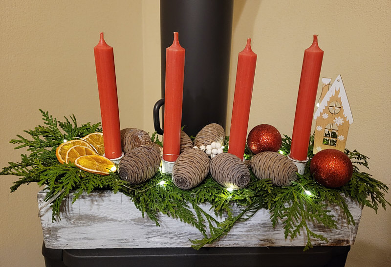... dieses Adventsgesteck hat sie selbst gemacht ... seht ihr die Zapfen ?