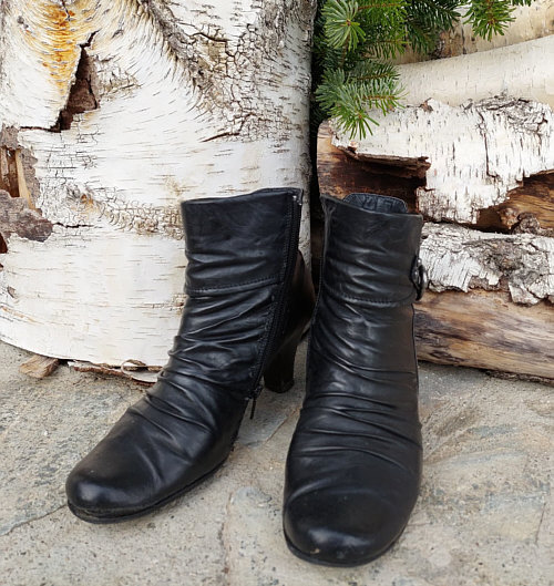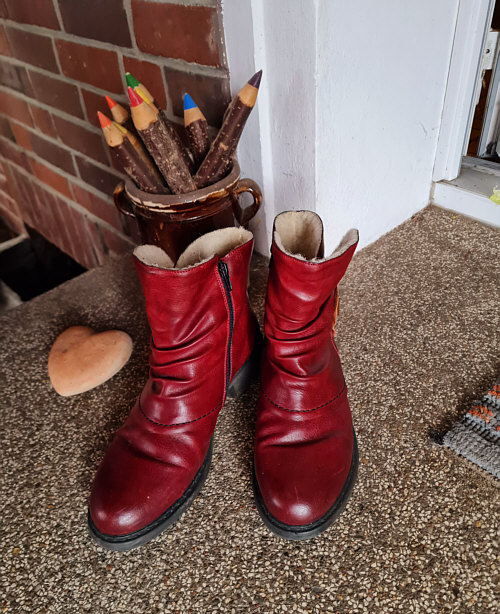 ein paar Schuhe/Stiefel/Schlappen vor die Tür und fotografiere sie.