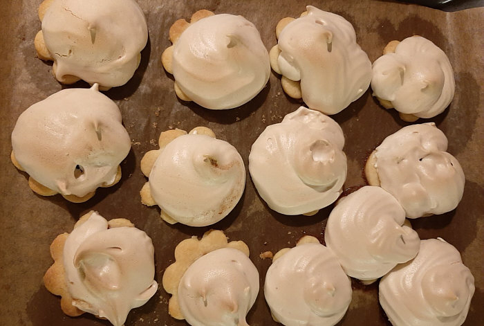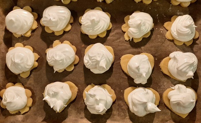 Den festen Eischnee mit Hilfe eines Spritzbeutels auf die Kreise spritzen