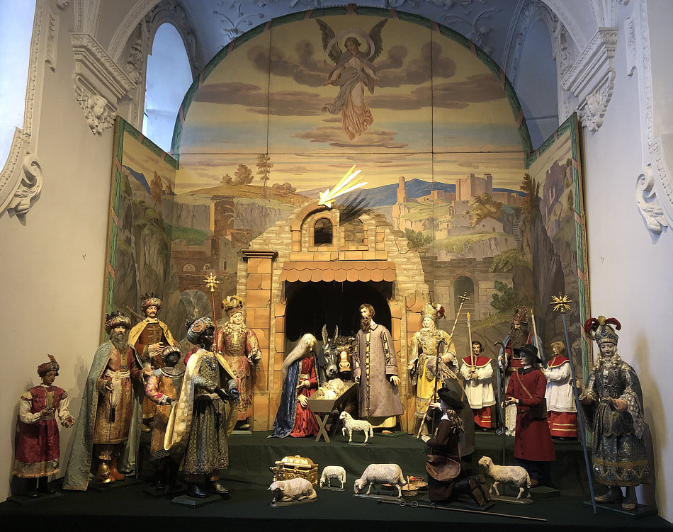 eine barocke Weihnachtskrippe mit bekleideten Figuren aufgestellt.