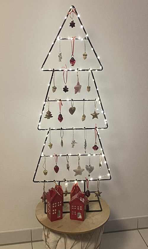 Dieser Metall-Tannenbaum nimmt bis zum Einzug des Weihnachtsbaums dessen Platz