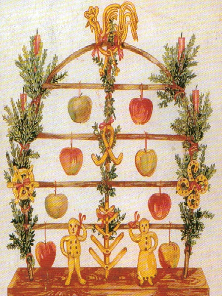 wie Äpfel, Rosinen und Backpflaumen als Dekoration angebracht.
