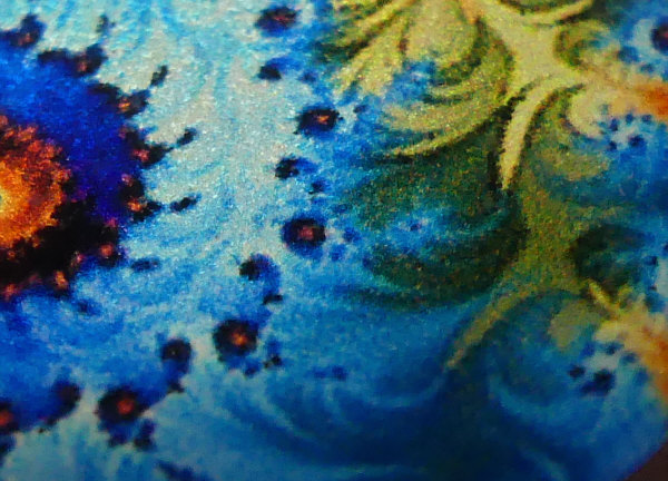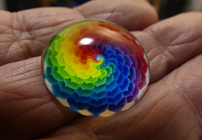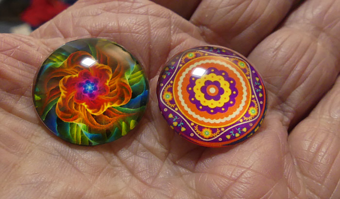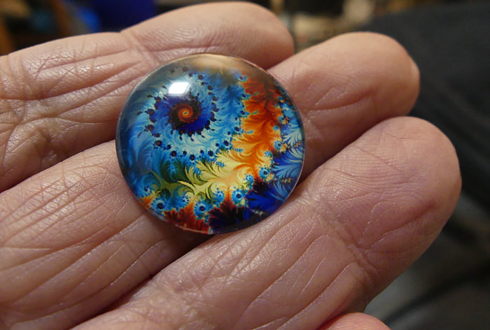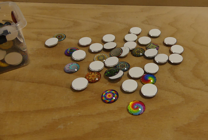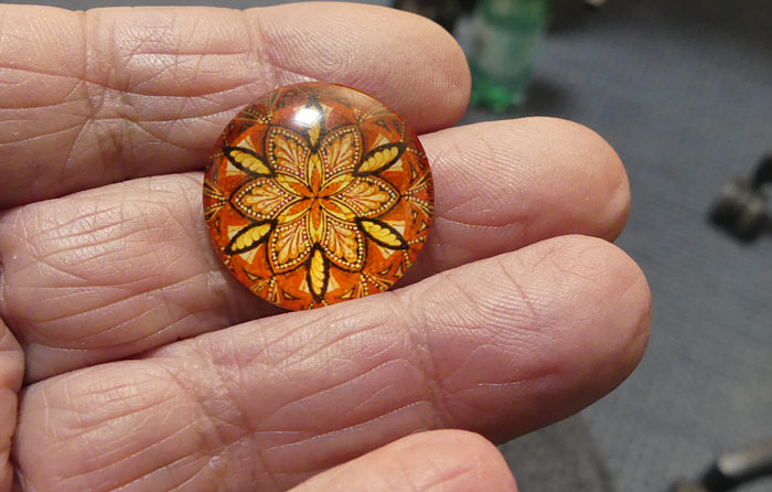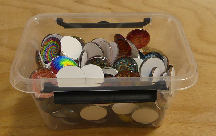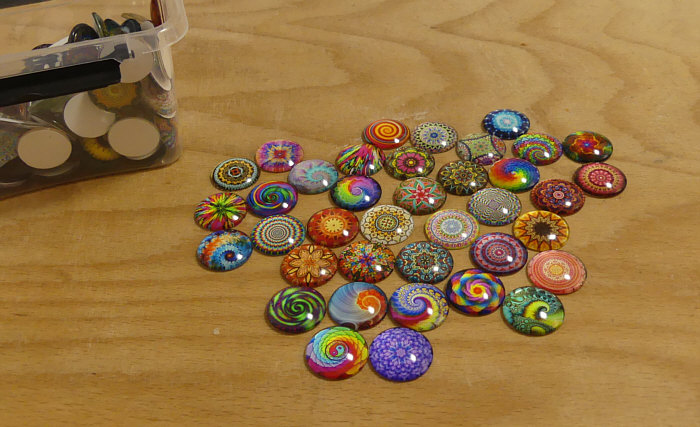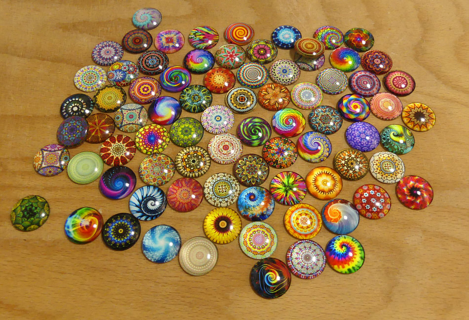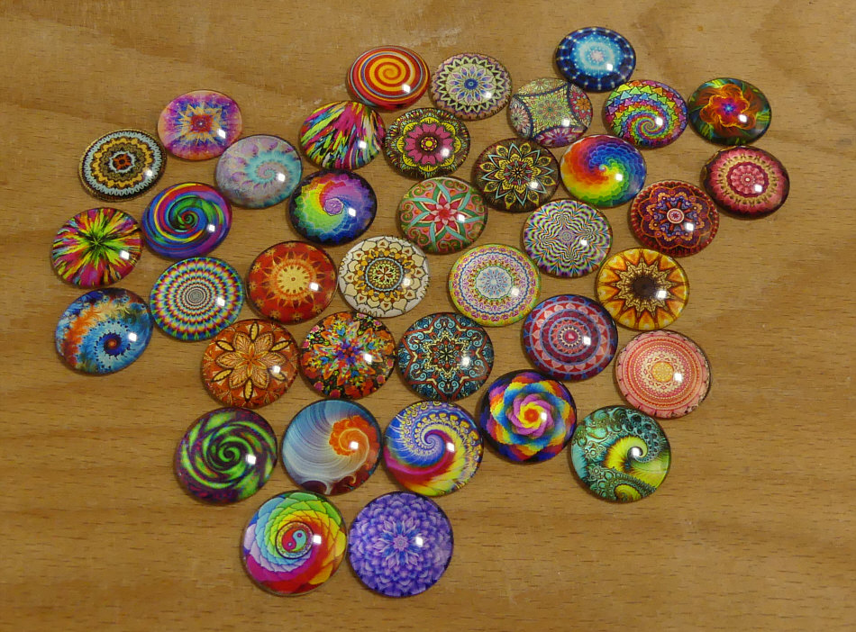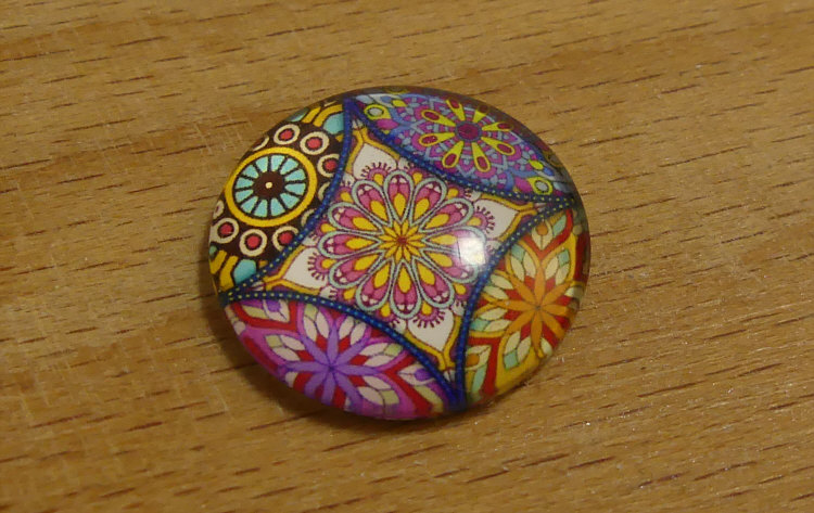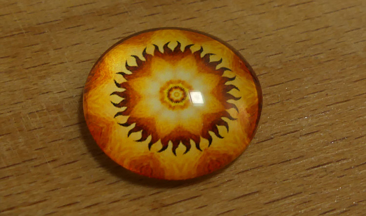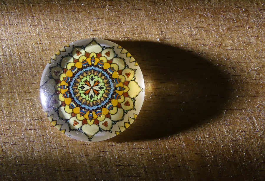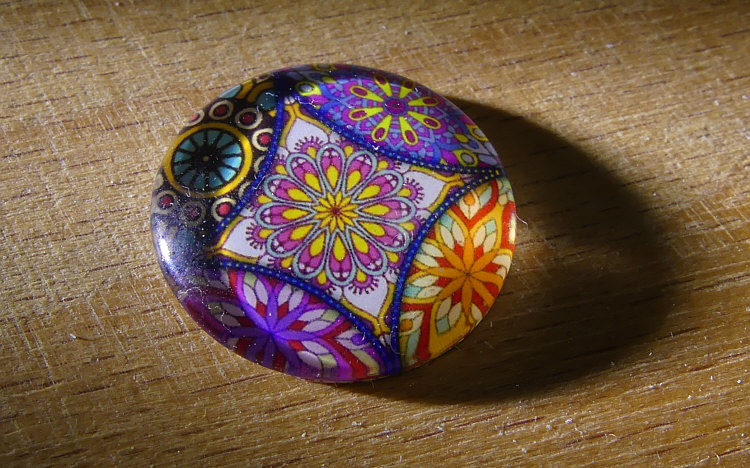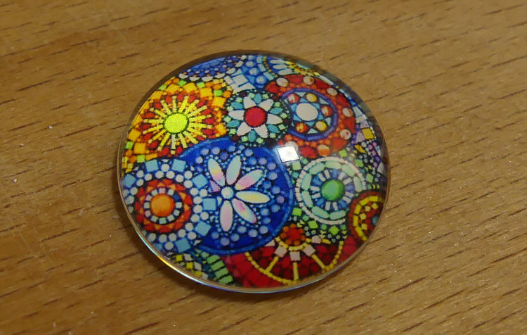 Nach dem Fotografieren stellte ich fest ... ![]() ... dass das Motiv nicht fürs Makro geeignet ist. Zu schlechte Qualität des Papierdrucks. Okay ... der ja auch nicht für ein Makro gemacht wurde ... ![]() ... soll ja nur schön aussehen und das Auge geht ja nicht so nah ran. Also zeige ich die bunten Kreise einfach mal so ... ... wobei ich grad überlege, ob ich die nicht schon mal gezeigt habe ? Ehrlich ... ich weiß es nicht ... ich mach einfach mal so, als wäre dem nicht so. ![]() Eine kleine Glaskuppel wölbt sich ... ![]() ... über bedrucktem Papier. Bunt sind sie alle, aber auf ganz unterschiedliche Weise ... ![]() ... wenn man die Vorderseite betrachtet ... ![]() ... und so sieht die Rückseite aus: ![]() Ich hab da ein ganzes Kästchen davon ... ![]() ... und noch ein Beutel und vielleicht woanders auch noch welche. ![]() Na ... Rückseiten gehn ja gar nicht ... schnell mal alle umdrehen ... ![]() ... und natürlich in größer zeigen: ![]() Man kann damit Anhänger machen oder Ohrschmuck oder diverse Sachen bekleben oder bunte Bilder legen oder sie in ihre ganzen Buntheit ... ![]() ... einfach nur betrachten. Vielleicht zuerst viele zusammen und danach einzeln: ![]() ![]() ![]() Vielleicht auch mal mit dem Licht spielen ... so ändern sich beim Fotografieren die Farben vom Zimmerlicht ... ![]() ... zur Taschenlampenbeleuchtung: ![]() Und ja ... beim näher rangehen und bei Taschenlampenbeleuchtung immer an den Staub denken, denn der wird auf einmal sichtbar, was ich beim folgenden Bild erst nachher so richtig gemerkt hatte. Tja, das Brett, auf dem die Steine liegen, steht halt offen hochkant an einem Schrank und im Laufe der Zeit staubt es zu. Ja, hätte ich vorher mal abstauben sollen ;). ![]() Könnte sein, dass Fragen kommen, wo es diese schönen Glassteine (Muggelsteine, Glascabochons) gibt, darum hab ich hier gleich einen Link für Euch: gemischte Glassteine. |