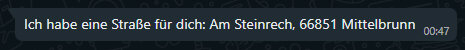 ![]() Heute Engelbert Und das kam so ... halb im Ernst, halb im Spaß habe ich zu Birgit gesagt: "eigentlich könnte doch auch mal jemand mich zu einer Straße schicken". Denn was andere tun sollen, darf ich doch gerne vormachen. Bzw. auch mitmachen. Sonst heißt es womöglich noch "der schickt immer die Leute durch die Gegend, aber selber lässt er sich nicht auf die Aufgabe ein" ... ... doch, das macht er. Birgit ließ sich natürlich nicht lumpen und nach kurzem Überlegen fand ich das bei Whatsapp: ![]() Aha ... vor zwei Jahren waren wir in Mittelbrunn und sind eine große Runde durch den Ort gelaufen. ![]() Doch ausgerechnet die Straße "am Steinrech" (rot) sind wir nicht gelaufen. Birgit hat natürlich eine gewissen Fallhöhe eingebaut ... ![]() ... denn diese Straße ist gerade mal ... ![]() ... 220 Meter lang. Mit normalem Schritt ist man da in 5 Minuten durch. Uff. Keine Angst, wenn ich Straßen aussuche, dann sind die immer länger. Aber kein Problem ... ich habs versucht. Vor ein paar Tagen war ich dort. ![]() Das ist die Straße: ![]() Beate war natürlich dabei und hat auch sofort "guck mal da" gesagt. Ich hab ihr dann erklärt, dass sie bitte 220 Meter lang mich nicht auf evtl. Motive hinweisen soll ... denn das soll ja eine Aufgabe sein, die ich selbst ganz ohne Hilfe erledige. Das sind meine Bilder: ![]() Vom Anfang der Straße aus hatte man einen Blick in Richtung Wald. ![]() Das ist das "guck mal da"-Bild ... aber da ich ja ein Bonusbild zeige, komme ich ja dennoch auf zehn Bilder. Das ist eine Ente ... warum steht die da ? Weil die Mauer zu einem Haus mit einem Versicherungsbüro gehört, das auch Kfz-Versicherungen anbietet. ![]() So süß im Vorgarten. ![]() [ ohne Worte ] ![]() Ein Ufo ist gelandet. Auf dem Ufo ein Hinweis, dass die Außerirdischen lustige Leut' sind ;). ![]() Wie gut, dass in dieser kurzen Straße ein Hof ist, in dem Pferde auf einer kleinen Koppel stehen. ![]() Und auch ein Pony. ![]() Gedankenverloren inmitten weißer Kreide. ![]() In dieser Straße gibt es auch einen Weinberg (eine Seltenheit in dieser Gegend). ![]() Kunst ... würde gerne fliegen, kann aber nicht. ![]() Mein Bonusbild ... Kuh mit Glocke an einer Hauswand. Ja, war spannend ... auch anspannend ... und hat viel Spaß gemacht ... danke :)). |