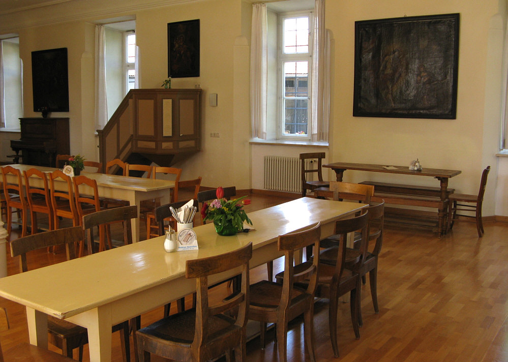 ![]() Wir sind heute in einem "Refektorium", so nennt sich der Speisesaal eines Klosters. In einem solchen kann es eine "Tischlesung" geben ... so wird die Vorlesung von Literatur während einer gemeinsamen Mahlzeit bezeichnet. Ihre Wurzeln reichen im Christentum bis in die Spätantike zurück, ein wichtiges Motiv ist dabei das Evangelium nach Matthäus 4,4 - Der Mensch lebt nicht vom Brot allein, sondern von einem jeglichen Wort, das durch den Mund Gottes geht. In manchen Ordensregeln wurde die Tischlesung vorgeschrieben. (doch lieber nicht in diesen Raum ... klicke hier) |