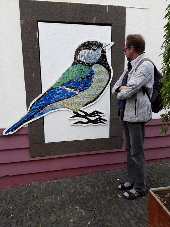 Mit Angelika V. nach Madeira Folge 4 ( Folge 1 - Folge 2 - Folge 3 ) Heute gibts ganz besondere Bilder ... ![]() ![]() ... das ist Kunst. Ja, eigentlich ist es Müll ... aber dennoch Kunst. Irgendwo zwischen recyceln und zeigen, was alles möglich ist. Zwischen aufmerksam machen und den Betrachter erfreuen. ![]() ![]() ![]() ![]() Die kleinen weißen Kästchen sind die Ausschnitte, die obendrüber zu sehen sind. Und jetzt mal alle Bilder zusammen gezeigt: ![]() ![]() ![]() ![]() ![]() ![]() ![]() Hier sieht man Angelikas Mann und die Größe der Kunstwerke. ![]() All diese Bilder sind aus Getränkedosen gemacht. Und nun ... noch eine Nacht schlafen ... ... schnarch ... ... und am Morgen sieht das Meer so aus: ![]() Ein perfekter Tag, um eine schöne Wanderung zu machen. Die ich in der nächsten Folge zeigen werde. |