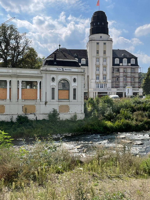 Für alle, die sich gestern gewundert haben, dass Margots Straßenbilder mit einem Bild ganz ohne Fazit geendet haben ... ... es geht heute noch weiter. ![]() Teil 2 Margot schreibt und zeigt: Neben zahlreichen Wildblumen am Ufer der Ahr ist diese Rose ... ![]() ... die einzige kultivierte Blume, die ich entdecken konnte. Das Foto der Rose ist die Schnittstelle zu der zweiten Fotostrecke, die ich euch von der Lindenstraße zeigen möchte. Der Bausand hinter der Rose zeigt das Thema des zweiten Teils. Das Ahr-Hochwasser vor zwei Jahren und die immer noch sichtbaren Folgen. ![]() Ich konnte euch kein Foto des Straßenschildes machen, weil schlichtweg keines existiert. Die Flut 2021 hat es fortgespült, doch hier ein Foto, das beweist, dass wir in der richtigen Straße unterwegs sind, in der zuvor viele Klinken ansässig waren. ![]() Diese Bekanntmachungen sind sehr erwünscht, doch viele Geschäfte werden geschlossen bleiben. Die Menschenhaben keine Kraft und Ressourcen mehr zum Wiederaufbau. ![]() Hier seht ihr das Kurhaus auf der gegenüberliegenden Seite der Ahr etwas näher und könnt die Zerstörung besser sehen. Das unmittelbar an der Ahr stehende Kurhaus wurde 1905 fertiggestellt. Das 170 Meter lange im Neobarockstil errichtete Kurhaus, war wie so vieles aus dieser Zeit ein Repräsentationsbau, mit dem das junge und aufstrebende Bad Neuenahr mit anderen Kurorten wie Baden-Baden konkurrieren wollte. Mittelpunkt des Kurhauses ist der große Fest- und Theatersaal, um den sich die übrigen Räume gruppieren. Ein prächtiges Vestibül und Terrassen in westlicher und südlicher Richtung schließen sich dem Festsaal an. Gartensaal sowie der Kursaal bildeten mit dem Ensemble von Musikpavillon, Parkanlage usw.. . Von 1951 bis 1958 fanden die Bundespressebälle im Bad Neuenahrer Kurhaus statt. Erst nachdem in Bonn die Beethovenhalle fertiggestellt worden war, wechselte der Bundespresseball an den damaligen Regierungssitz. Die Flut von 2021 hat alles verändert. Sie zerstörte die Spielbank vollständig. Die hat inzwischen im aus der gleichen Zeit stammenden Bahnhof eine neue Bleibe gefunden. Alle anderen Gebäude sind noch nicht vollständig saniert. Aber man sieht überall fleißige Handwerker. Ein Gebäude, das die Verwaltung beherbergte musste abgerissen werden. ![]() Ob hier noch einmal frisiert werden wird? Es mutet an, als solle Gras über die Sache wachsen mit dem Grün in der Einfahrt. Doch oft scheitert der Aufbau an fehlenden Gutachten oder Versicherungszahlungen. Hinter den Bildern steckt viel Leid, auch heute noch. ![]() Das Café Renaissance ist ein positives Beispiel für einen gelungenen Aufbau. Seit diesem Jahr ist es wiedereröffnet. Bei schönem Wetter ein beliebtes Ziel mit seiner Lage an der Ahr spüren die Besitzer an Schlechtwettertagen, dass weniger Touristen da sind und die Einwohner vor Ort sind vielmals mit dem eigenen Aufbau beschäftigt. ![]() Ein Anblick, der hier ganz normal ist. Überall Baugerätschaften, Gewerke und vor allem auch Geräusche. ![]() Das meist gesehene Fahrzeug an der Ahr sind seit zwei Jahren Transporter von Handwerkern und Firmen. Ich war zur Mittagszeit unterwegs und es war schwierig, Fotos zu machen ohne Menschen, da fast vor jedem Haus Handwerker saßen und ihre Mittagspause an der frischen Luft verbrachten. ![]() Mit Schaufel und Eimer kamen vor zwei Jahren unzählige Helfer in die Flutgebiete, ein Teil bis heute und leisten Hilfe beim Wiederaufbau. Diese #solidahrität zu erleben ist unbeschreiblich. Sie gibt den Glauben an die Menschlichkeit zurück. Das klingt pathetisch, aber beschreibt es gut. Busseweise kamen sie an und aus Fremden wurden Freunde. Hier sind noch Handabdrücke mit Flutschlamm verewigt, der dann zu Flutstaub wurde, der Fahrzeuge aus dem Tal überall unverwechselbar und erkennbar machte. ![]() Leerstehende Wohnungen neben wieder bezogenen. Viele Mieter kommen nicht mehr zurück. Zu eindringlich und stark sind Angst und Erinnerungen an die existenzbedrohende Flutnacht. Eine Dame, zu der ich Kontakt habe lebt jetzt in der Eifel, "weit weg von jedem Gewässer". Das Trauma sitzt tief: Regen, die Dusche lässt die Angst wiederkehren bei vielen Betroffenen. Andere bekommen Gänsehaut, wenn sie Hubschrauber hören, weil diese tagelang über der Stadt unterwegs waren, um Menschen zu bergen. ![]() Auf der gegenüberliegenden Seite der Ahr begann meine Führung. Hier seht ihr nun das Ende der Straße. ![]() Auch der schöne Fußweg endet hier. Für Fahrradfahrer gibt es teilweise Ausweichstrecken. ![]() Doch die Situation in den Flutgebieten ist teils immer noch sehr bedrückend und wird nicht so schnell überwunden sein. Schließen möchte ich mit zwei Fotos. ![]() Zum einen noch eine der wunderschönen Villen der Lindenstraße, bei der zum Glück der Aufbau im Gange ist. ![]() Und zum zweiten mit dem Portal der Kirche am Beginn der Straße. Leider ist deren Tür noch geschlossen, da hier große Schäden am Bauwerk sind. Doch die Hoffnung bleibt, dass auch diese Tür sich eines Tages wieder öffnet und ich noch einmal den Gospelchor hier singen hören darf! ![]() Natürlich wurde mein Blick hierauf gelenkt und die Gänsehaut ist auch jetzt wieder da. Gedenkstätten für die vielen Toten finden sich überall im Tal und den anderen Flutgebieten. Zum Schluss ein herzliches Dankeschön an Engelbert für diese Aktion und dass er eine Straße an der Ahr herausgesucht hat. Wer in der Region lebt, bleibt nicht unberührt von diesem Flutereignis. Der Aufbau wird noch Jahre, teils Jahrzehnte dauern. Ich habe mich für die geteilte Darstellung entschieden, da in der Presse oft zu positive Bilder gezeigt werden; besonders Politiker, die auf Stippvisite da sind lassen sich vor "ihren Erfolgen" ablichten. Im Tal sind viele Menschen davon enttäuscht. Aber es gibt das Schöne, was ich mit Tour eins zeigen will und es gibt die Schäden und Herausforderungen in Teil zwei. Beides innerhalb der halben Stunde eingefangen. Ich würde gerne diese Fot
