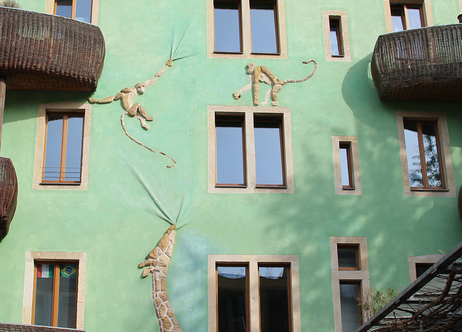 Giraffe, Affe und Kranich sind an der Hauswand zu finden