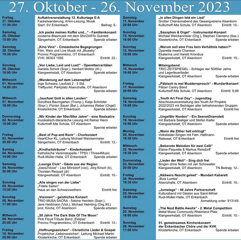 Enkenbach-Alsenborn ist ein größeres Dorf, bei dem sich zwei Gemeinden zu einer Gemeinde zusammengeschlossen haben. Insgesamt leben gut 7000 Menschen dort. Dort finden im Herbst vier Wochen die Kulturtage statt. Warum das ein Kalenderblatt ist ? Weil ich über die Vielfalt, die es dort gibt, erstaunt bin. Nehmt Euch mal die Zeit und schaut den folgenden Plan ganz in Ruhe durch ... die Bandbreite geht von Blasmusik zu Heavy Metal, von christlichen Liedern bis Pink Floyd, von Schlagern über Chanson bis Pop. ![]() |