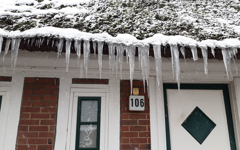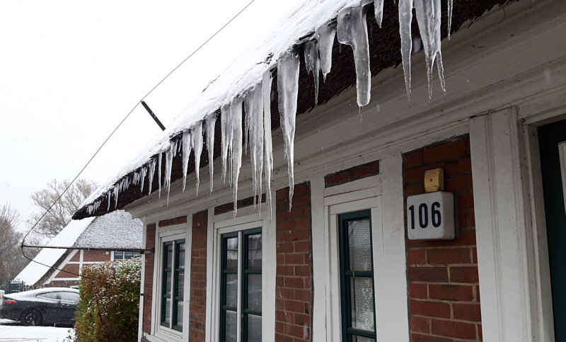In Hamburg-Curslack fotografiert ... so lange Eiszapfen an einem Strohdachhaus