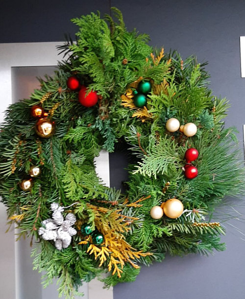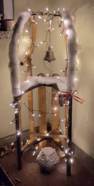 ... einem Türkranz und diesem beleuchteten Schlitten: