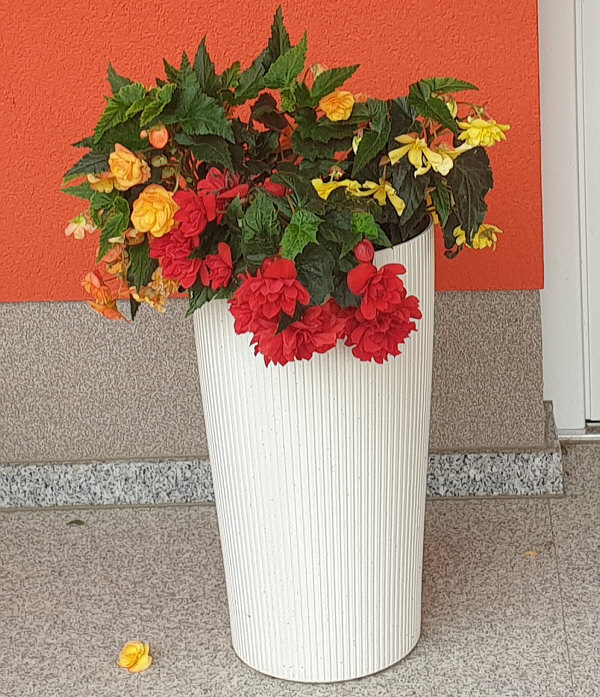 ein ganz normaler Blumenkübel mit Hänge-Begonien drin.