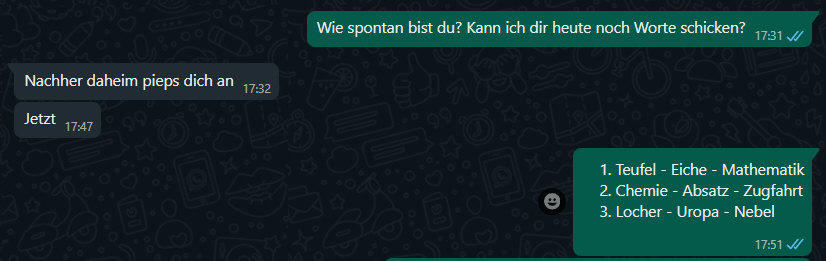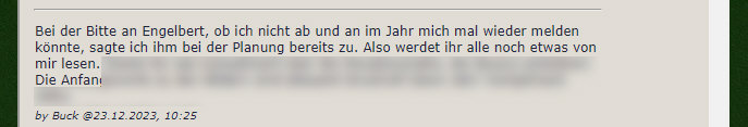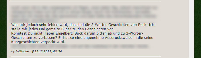 Gestern im Lichtblick: ![]() Burkhard Jysch in Fotos vorgestellt. Wenn ich Burkhard sehe oder von ihm lese, dann fällt mir immer Juttinchens Kommentar vom 23. Dezember ein: ![]() Was Juttinchen nicht wusste ... schon im November war mir und uns klar, dass es diese Geschichten mit eingebauten Worten nicht nur im Adventskalender, sondern auch darüber hinaus geben wird. Immer wieder mal im Kalenderblatt in diesem Jahr. Buck (Kurzform von Burkhard Jysch) hat dann auch geantwortet: ![]() Und so hab ich gestern Nachmittag ganz spontan ihn gefragt: ![]() Und ... man glaubt es kaum ... schon eine Stunde später ... ![]() ... hatte ich die Geschichten in meinem Posteingang. Dem Mann legst du Worte hin und sein Gehirn rattert los und bastelt spontan kleine Geschichten daraus. Geschichten, die erst durch die vorgegebenen Worte entstehen. Hier sind sie: Teufel Eiche Mathematik Wenn er vor der Klasse stand, wirkte er wie ein Ringkämpfer auf die Schüler, besaß er dazu noch eine nicht zu überhörende Stimme, die er mit längst bewährten Worten auf die Dummköpfe vor ihm abfeuerte. Sein Fach war Mathematik, da kannte er sich aus, ging mit Zahlen um, als wären es Geschöpfe der Natur. Zum Beispiel die einer Eiche, deren Wurzeln tief in den Boden krallten, um darauf das Sichtbare der Sonne entgegen zu strecken. An ihr gab es kein Rütteln wie in der Mathematik, und wenn es auf fruchtbaren Boden in den Köpfen der Schüler ankam, wurde daraus sein Erfolg. Richtig beantwortete Fragen in den Klassenarbeiten, dem Höhepunkt seiner strengen Schulung. Bei den meisten hieß er der Teufel, nicht Herr Sowieso, denn er schien auch noch die Gabe eines Spürhundes zu haben, wenn es um Spickzettel ging, die er schnell fand. Sein plötzliches Ende entsprang einer seltenen mathematischen Fehleinschätzung. Der Lastwagen war näher als er geschätzt hatte und übersah ihn schlicht. Chemie Absatz Zugfahrt Manchmal passieren Dinge, die passieren einfach. Wenn nahezu ganzjährig nichts passiert, man nicht einmal eine Ahnung hat, dass es heute passiert, dann ist es so. Schicksal, sagen die Einen, gibt's nicht die anderen. Bei den Beiden, von denen ich hier spreche, war es die gemeinsame Zugfahrt im selben Abteil, das lange Warten bis der Zug einfuhr, das Gedrängel, der Kampf um die freien Plätze, der schon verloren schien, als sich ihr Absatz vom Schuh verklemmte und fast abriss, immerhin aber noch soweit dran blieb, dass sie vorwärts kam oder rückwärts, man wusste es nicht. Nicht unbemerkt von ihm, der ihr Malheur im Augenwinkel mitbekam, und ihr den letzten gegenüber liegenden Platz im Abteil frei hielt. Da sah sie ihn zum ersten Mal. Zu ihrem hübschen Gesicht stimmte seine weiche Stimme, der Blick in die Augen einen bedeutsamen Moment zu lang, und dieses merkwürdige Gefühl mehr erfahren zu wollen als die Zugfahrt dauerte. Man könnte sagen, eine Sache der Chemie. Oder war es doch Schicksal, als sie Jahre später gemeinsam mit den Kindern wieder in den Zug stiegen? Reserviert für vier und glücklich. Locher Uropa Nebel Man sagt ja allgemein, dass Rentner die wenigste Zeit haben. Ich fühle mich sofort angesprochen und nicke zu der Behauptung, wenn ich da Zeit zu habe. Zu den Dingen, die ich vor mir her schiebe, gehören beachtliche Stapel von Papieren, die man mal ablegen sollte in Ordnern, wo man sie bei Bedarf wieder findet. Man braucht dazu aber außer einem Locher Zeit, die am besten geeignet ist, wenn draußen weder die Sonne scheint, noch jemand zu einem Spaziergang einlädt. Oder das Wetter spielt in die Karten. Bei Nebel zum Beispiel wäre so ein Tag. Man sieht sowieso nichts und wenn, dann kann es sein, dass man sogar etwas findet. In einem der vielen Ablagen entdeckte ich den Wehrpass des Uropas, seinen letzten Dienstgrad, seine Beförderungen im Krieg, und sogar das Eiserne Kreuz für herausragende Verdienste ums Vaterland in einem kleinen, unscheinbaren Kistchen mit einem typischen Kreuz vorn. Ich hätte meinen Opa danach fragen sollen, denn es musste von diesem zu mir von seinem Vater gewandert sein, den langen Weg der Geschichte, bis es im Nebel plötzlich wieder auftauchte ... |
