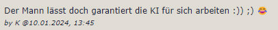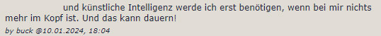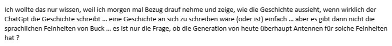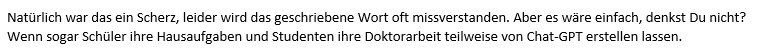 Ihr könnt Euch doch sicher an Bucks Geschichten mit den Zufallsworten erinnern, die hier vorgestern im Kalenderblatt standen. Ein Kommentar dazu lautete: ![]() Mit Smiley, also scherzhaft gemeint ... Buck hatte reagiert: ![]() Alles klar ... ich hab dennoch mal sicherheitshalber bei der Dame, die kommentiert hatte, nachgefragt: ![]() Die Antwort sagt das: ![]() So hatte ich das auch verstanden ... als Scherz. Und ich gab diese Antwort. ![]() Bilder von der KI gibts ja hier öfters, aber mit KI-Texten hatte ich bisher nichts am Hut. Doch erstmalig und einmalig will ich das heute mal wissen und zeigen. Ich habe den ChatGpt gebeten, mir eine kleine Geschichte zu schreiben, in der die Worte Teufel, Eiche und Mathematik drin sind ... hier ist das Ergebnis: Es war einmal ein kleiner Teufel namens Max, der in einem dunklen Wald lebte. Eines Tages entdeckte er eine majestätische Eiche, die mitten im Wald stand. Fasziniert von ihrer Schönheit und Stärke beschloss Max, die Eiche zu besuchen. Als er näher kam, bemerkte Max, dass die Eiche von einer Gruppe von Tieren umgeben war. Sie schienen alle Probleme zu haben und waren verzweifelt. Max, der ein freundlicher Teufel war, fragte, ob er ihnen helfen könne. Die Tiere erklärten, dass sie Schwierigkeiten mit der Mathematik hatten. Sie konnten einfach keine Lösungen für ihre Probleme finden. Max, der ein Experte in Mathematik war, bot sofort seine Hilfe an. Er begann, den Tieren die Grundlagen der Mathematik beizubringen und half ihnen, ihre Probleme zu lösen. Die Eiche, die alles mitbekam, war beeindruckt von Max' Fähigkeiten und seinem Wunsch, anderen zu helfen. Nach einiger Zeit hatten die Tiere ihre mathematischen Fähigkeiten verbessert und waren in der Lage, ihre Probleme eigenständig zu lösen. Sie waren so dankbar für Max' Hilfe, dass sie beschlossen, ihm eine besondere Belohnung zu geben. Die Eiche öffnete ihre Äste und enthüllte einen geheimen Raum, der voller Bücher über Mathematik war. Max war überwältigt von der Großzügigkeit der Eiche und versprach, ihr Wissen weiterhin zu nutzen, um anderen zu helfen. Von diesem Tag an wurde Max als der freundliche Teufel bekannt, der die Tiere des Waldes in Mathematik unterrichtete. Die Eiche und Max wurden enge Freunde und verbrachten viele glückliche Tage zusammen. Diese Geschichte zeigt, dass selbst ein Teufel mit seinen Fähigkeiten und Wissen anderen helfen kann, und dass die Natur manchmal überraschende Belohnungen bereithält, wenn man anderen Gutes tut. Was sagst du zu dieser Geschichte ? Ein zweites Experiment ... ich habe gebeten: "Bitte schreibe eine kurze Gute-Nacht-Geschichte, die ich heute Abend meinem Enkel vorlesen kann. Das kam dabei raus: Es war einmal ein kleiner Junge namens Tim, der sich jeden Abend auf eine abenteuerliche Reise in seine Träume begab. Eines Abends, als er sich in sein kuscheliges Bettchen legte, schloss er die Augen und begann zu träumen. In seinem Traum fand sich Tim plötzlich in einem zauberhaften Wald wieder. Die Bäume waren so hoch, dass sie den Himmel zu berühren schienen, und die Blumen leuchteten in den schönsten Farben. Tim konnte kaum glauben, wie wunderschön alles aussah. Während er durch den Wald spazierte, traf er auf eine Gruppe freundlicher Tiere. Da war eine kluge Eule, die ihm Ratschläge gab, ein verspielter Hase, der mit ihm um die Wette hoppelte, und ein sanfter Bär, der ihn beschützte. Gemeinsam erlebten sie viele aufregende Abenteuer. Sie erkundeten geheime Höhlen, fanden versteckte Schätze und trafen sogar auf eine sprechende Blume, die ihnen Geschichten aus vergangenen Zeiten erzählte. Als die Nacht langsam voranschritt, wurde Tim müde und sehnte sich nach seinem gemütlichen Bettchen. Die Tiere brachten ihn sicher zurück und wünschten ihm eine gute Nacht. Als Tim aufwachte, fühlte er sich glücklich und erinnerte sich an all die wundervollen Erlebnisse in seinem Traum. Er wusste, dass er jederzeit wieder in diese magische Welt zurückkehren konnte, indem er einfach die Augen schloss und träumte. Und so schlief Tim jede Nacht mit einem Lächeln im Gesicht ein, in Vorfreude auf die nächsten Abenteuer, die ihn in seinen Träumen erwarten würden. Könntest du dir vorstellen, deinem Enkel eine solche Geschichte zu erzählen ? Würdest du diese Geschichte sofort als KI-Geschichte identifizieren, wenn sie in einem gute-Nacht-Geschichten-Buch zu finden wäre ? Deine Gedanken zu diesem Thema ? |