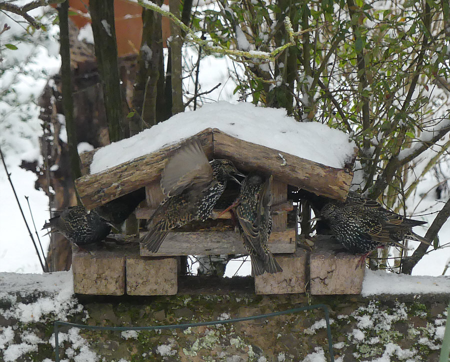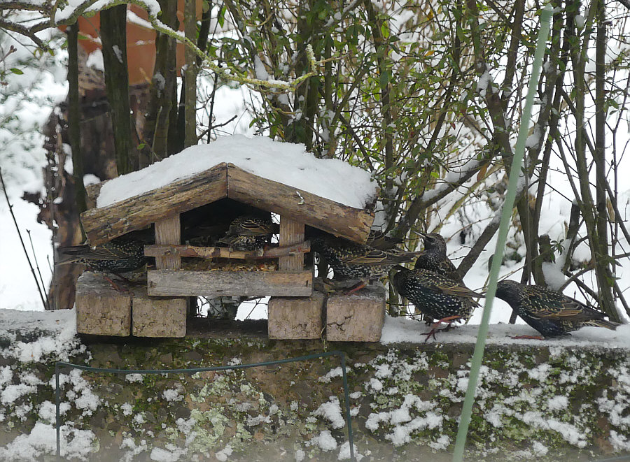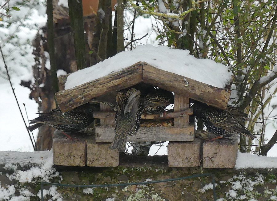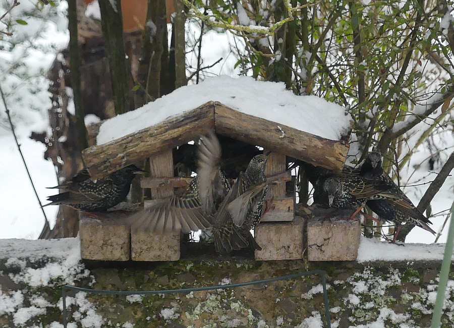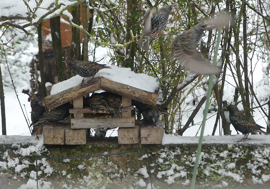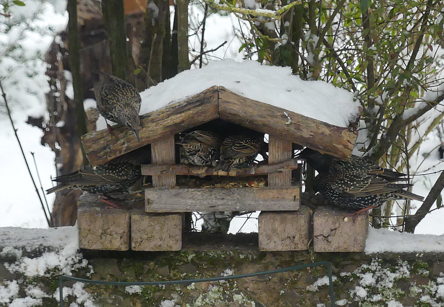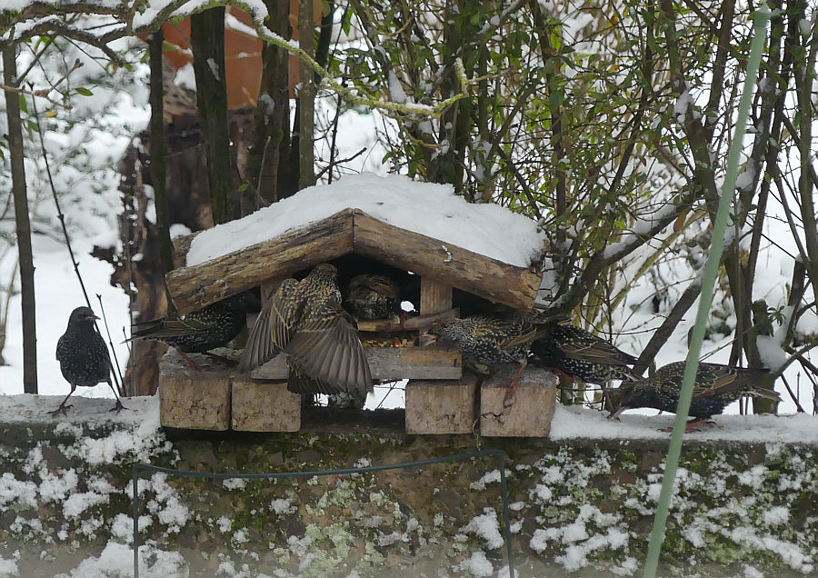 Wenn wir von einem viel haben ... dann sind es Stare. Wenn es so richtig kalt wird und nachts sinds im Moment unter minus 10 Grad bei uns, dann finden sich Stare in großen Mengen im Garten bei Beates Futterplätzen ein. Da wirds hektisch, drängelig und eng. Einfach mal ein paar Fotos von gestern: Wo sind denn eigentlich die ganzen anderen hin ? Die sind alle beim Haus ... ![]() Weg da ... meins ... ich lande ... ich will rein ... ![]() Macht doch mal Platz ... mir auch ... mach dich nicht so dick ... geh mal wech ... ![]() Vordrängler kann ich ja gaaar nicht leiden ... ![]() Weißt was ... da pass ich auch noch rein ... ![]() ... siehste ... es ist doch genug Platz für alle ... ![]() Wolle mer sie roi losse ... neeiiin !! ![]() Mir komme aber trotzdem rein ... ![]() Mal gucken, ob noch was da ist ... ![]() Ich seh nix, mal tiefer gucken ... ![]() Da hinten siehts auch mau aus ... ![]() Geh mal wech, du guckst nicht richtig ... ![]() Was heißt da "leer" ... hab aber Hunger ... ![]() Du, der sagst leer ... glaubst du, dass der uns verarscht ? ![]() Endlich ... Beate war da ! ![]() Bleibst du da wech, ich stech dir in den Bauch ... ![]() Ich Batman ... ![]() Schnell zur anderen Seite fliegen ... ![]() Meins ... nee, meins ... nee ich Hunger ... immer noch meins ... ![]() Komm, lass uns einfach gemeinsam essen ... ![]() Ich hab Hunger ... ich bin ja soooo gefräßig ... ![]() Mnjammamm, lecker Hamham ... ![]() Ich sitz nur da ... bin nur Zierde ... ![]() Bin sehr neugierige Zierde ... ![]() Ich hupf gleich zu euch hoch, dann wirds aber eng ... ![]() Was bist du so gefräßig ... und ich so geduldig ... noch ... ![]() Rüüülps ... vollgefressen ... hey, der fliegt mich gleich über den Haufen ... ![]() Gut, dass die alle beim grünen Dingens sind, da hab ich hier meine Ruhe ... ![]() Da drüben, da schmeckts am besten ... was man sich hier immer so verrenken muss ... ![]() Ich hab die schönste Zunge weit und breit ... ![]() Jetzt geht das Gedrängel hier auch schon los ... ![]() Schleich di, sonst zwick i di ! ![]() Hier drüben gibts auch feines ... ![]() Beeeaaate ... ist schon wieder leer ... |