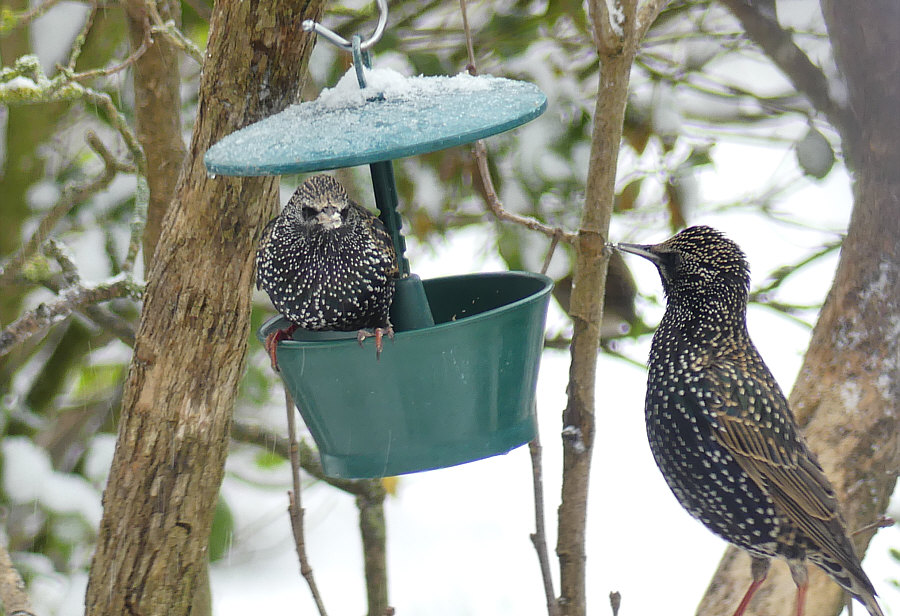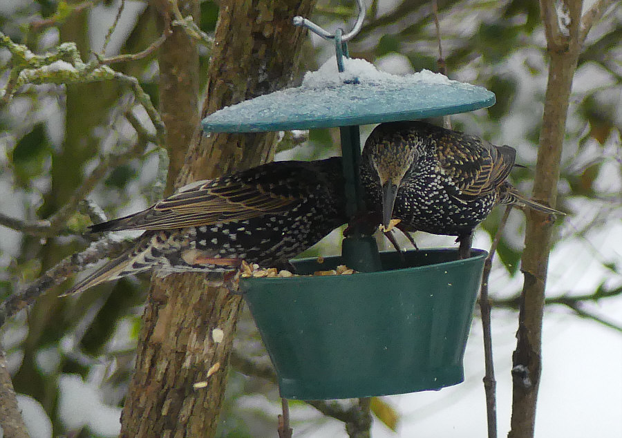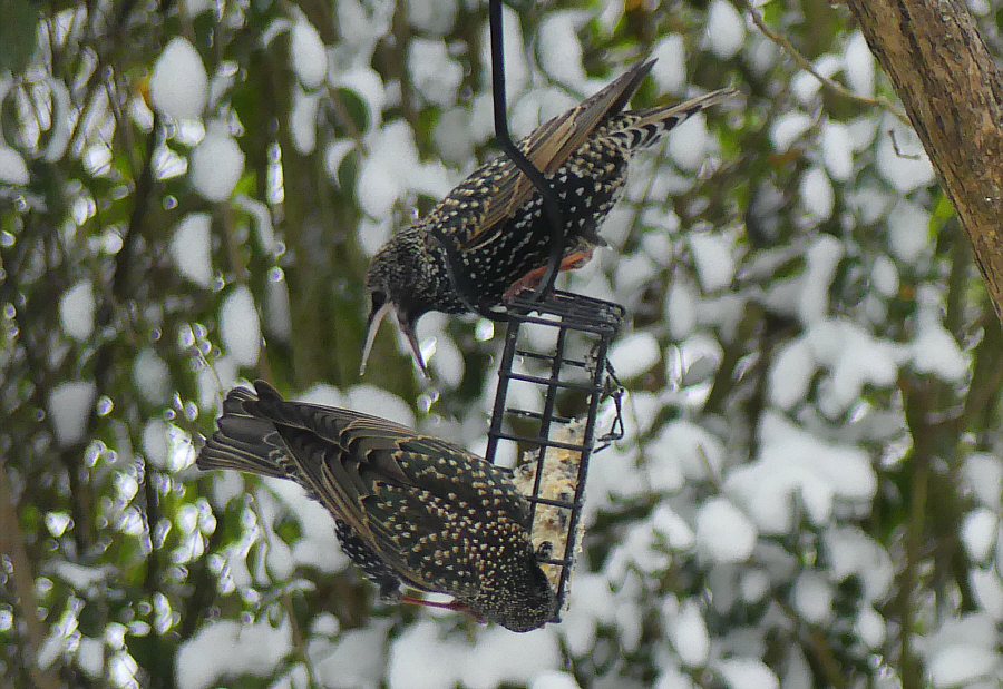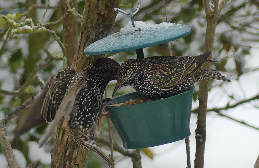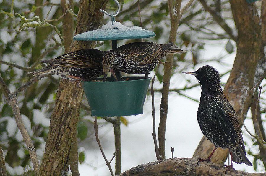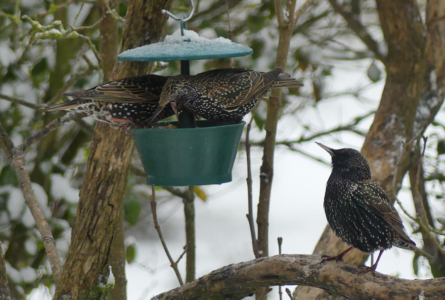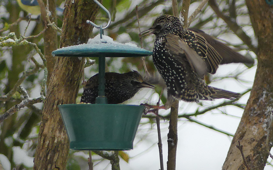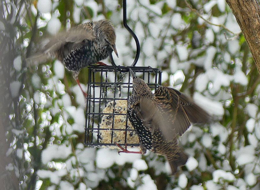 Wenn wir von einem viel haben ... dann sind es Stare. Wenn es so richtig kalt wird und nachts sinds im Moment unter minus 10 Grad bei uns, dann finden sich Stare in großen Mengen im Garten bei Beates Futterplätzen ein. Da wirds hektisch, drängelig und eng. Einfach mal ein paar Fotos von gestern: Wo sind denn eigentlich die ganzen anderen hin ? Die sind alle beim Haus ... ![]() Weg da ... meins ... ich lande ... ich will rein ... ![]() Macht doch mal Platz ... mir auch ... mach dich nicht so dick ... geh mal wech ... ![]() Vordrängler kann ich ja gaaar nicht leiden ... ![]() Weißt was ... da pass ich auch noch rein ... ![]() ... siehste ... es ist doch genug Platz für alle ... ![]() Wolle mer sie roi losse ... neeiiin !! ![]() Mir komme aber trotzdem rein ... ![]() Mal gucken, ob noch was da ist ... ![]() Ich seh nix, mal tiefer gucken ... ![]() Da hinten siehts auch mau aus ... ![]() Geh mal wech, du guckst nicht richtig ... ![]() Was heißt da "leer" ... hab aber Hunger ... ![]() Du, der sagst leer ... glaubst du, dass der uns verarscht ? ![]() Endlich ... Beate war da ! ![]() Bleibst du da wech, ich stech dir in den Bauch ... ![]() Ich Batman ... ![]() Schnell zur anderen Seite fliegen ... ![]() Meins ... nee, meins ... nee ich Hunger ... immer noch meins ... ![]() Komm, lass uns einfach gemeinsam essen ... ![]() Ich hab Hunger ... ich bin ja soooo gefräßig ... ![]() Mnjammamm, lecker Hamham ... ![]() Ich sitz nur da ... bin nur Zierde ... ![]() Bin sehr neugierige Zierde ... ![]() Ich hupf gleich zu euch hoch, dann wirds aber eng ... ![]() Was bist du so gefräßig ... und ich so geduldig ... noch ... ![]() Rüüülps ... vollgefressen ... hey, der fliegt mich gleich über den Haufen ... ![]() Gut, dass die alle beim grünen Dingens sind, da hab ich hier meine Ruhe ... ![]() Da drüben, da schmeckts am besten ... was man sich hier immer so verrenken muss ... ![]() Ich hab die schönste Zunge weit und breit ... ![]() Jetzt geht das Gedrängel hier auch schon los ... ![]() Schleich di, sonst zwick i di ! ![]() Hier drüben gibts auch feines ... ![]() Beeeaaate ... ist schon wieder leer ... |