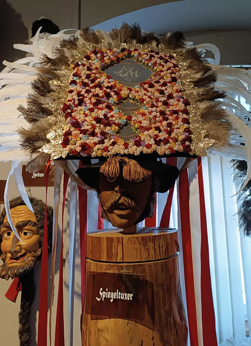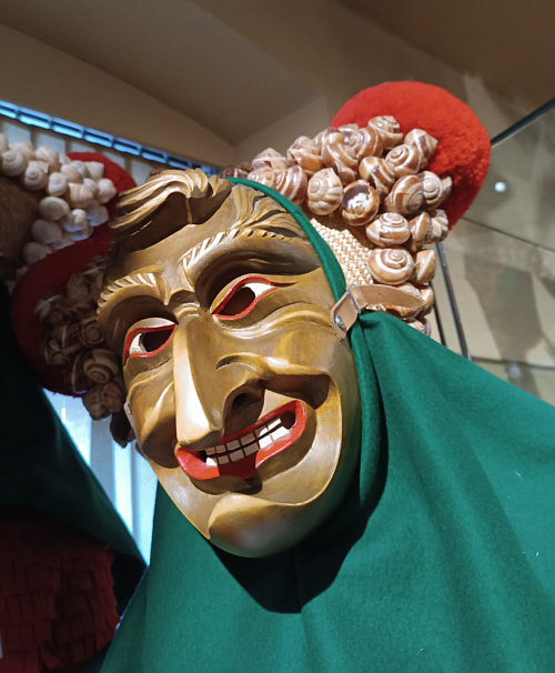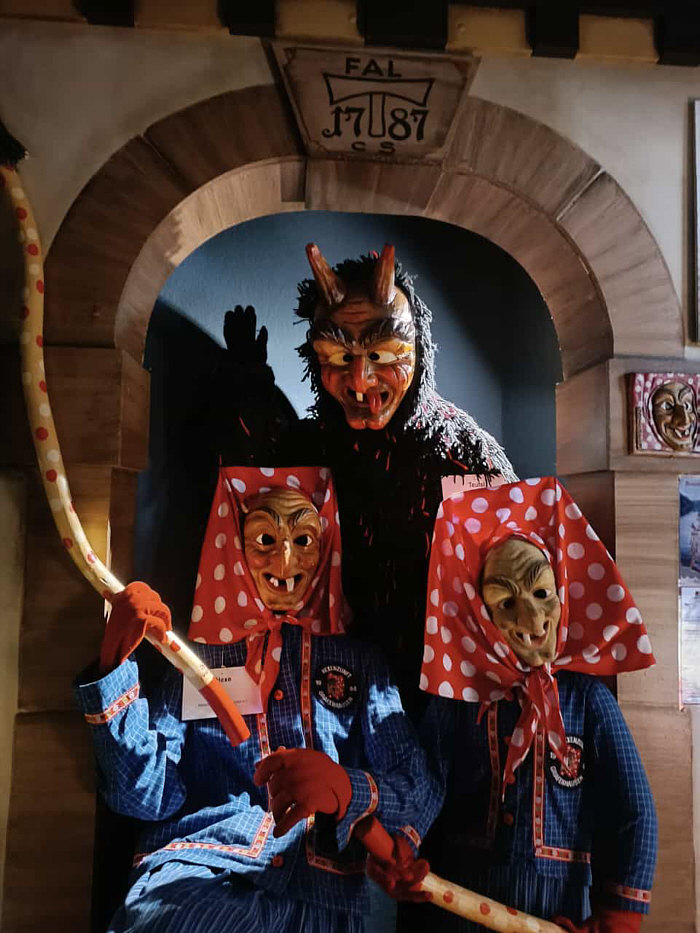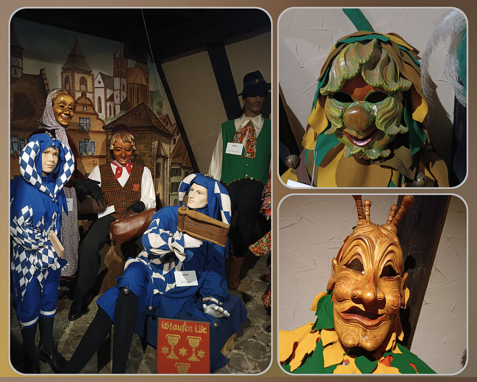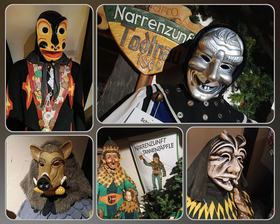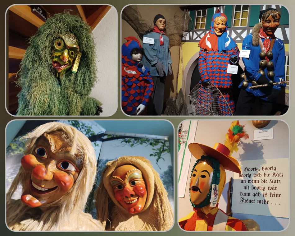 Heute sind wir hier ... ![]() ... bzw. Ina P. war hier und nimmt uns heute mit, damit wir auch sehen können, was sie gesehen hat. Wo sind wir hier überhaupt ? Weihnachtsbaum ? Narrenwappen ? Schauen wir mal genauer hin: ![]() Herrschaftshaus "Bettscholdt-Blumeneck" ... gut gut. ![]() Oberrh. Narrenschau ... scheint ja zum heutigen Tag zu passen ;). ![]() Welle-Bengel ... wer immer das ist. ![]() Verb Oberrh Narr ... ... was ausgeschrieben "Verband Oberrheinischer Narrenzünfte" heißt. Okay ... und nun ? Nehmen wir an einer Faschingssitzung teil ? Aber keinesfalls ? Lernen wir den Vorsitzenden kennen ? Nein ? Gehts um das Haus, also um die Bausubstanz ? Auch nicht ? Was denn ? Wir gehen in eine Ausstellung ... hä ? Ja, genau ... ich lasse mal Ina P. erzählen: Vor ein paar Tagen waren wir im Museum des VON (Verband Oberrheinischer Narrenzünfte) in Kenzingen. Der Verband wurde 1937 von 7 Zünften aus der Umgebung gegründet. Der VON hat heute 80 Mitgliedszünfte und ist in 6 Vogteien gegliedert. Ziel des Verbandes ist die Erhaltung und Pflege alter fasnächtlicher Bräuche. Die "Oberrheinische Narrenschau" in Kenzingen wurde 1976 eröffnet und 1979 sowie 1984 erweitert. Die Narrenschau in Kenzingen befindet sich in einem historischen Gebäude der traditionellen Üsenbergstadt, die 1249 gegründet wurde. Auf 5 Etagen werden über 300 Narrenfiguren in ihrem Häs, dem alemannischen Narrengewand, und über 600 Masken, Larven und Schemen, welche kunstvoll geschnitzt sind, vorgestellt. Sammlungen von fasnächtlichen Orden und Emblemen, Urkunden, Glasmalereien, Plaketten, Puppen und Gemälde runden die Narrenschau ab. Im Erdgeschoss ![]() Hier findet man die Vogtei (Ortsbezeichnung, früher nannte man so einen Gerichtsbezirk) Nördlicher Breisgau/Elztal. In dem alten, früher vorderösterreichischen Gebiet nördlich von Freiburg finden sich in vielen Orten des Elztals bis zu den Schwarzwaldhöhen und in der alten Narrenstadt Kenzingen sogenannte Häsfiguren, die für die Landschaft repräsantiv sind. Als Häs wird hier bei uns das Narrenkostüm bezeichnet, welches aus einem vollständig handgearbeiteten Narrenkleid, sowie einer meist aus Holz geschnitzten Maske, oft auch Larve genannt, besteht. ![]() Ein "Kleebolle" ... ein blühender Klee. ![]() Biberacher Fasent mit Bergwerksgeist, Reiherhexe und Biber. ![]() Schuttig aus Elzach (mit Schneckenhäuschen) ![]() ![]() 1. Obergeschoss: ![]() Hier ist die Vogtei Ortenau. Nördlich des Breisgaus schließt sich die Ortenau an, eine Landschaft in der zahlreiche alte Zünfte die Fasnet seit Jahrhunderten begingen und junge Zünfte brauchtumsgerecht auftreten. Zahlreiche Hexenzünfte stellen sich gemeinsam in einem Raum vor. Ebenfalls auf diesem Stockwerk vertreten ist die Brauchfasnet des Landes Tirol. ![]() Eine Selbacher Eule. ![]() ![]() ![]() Masken aus Tirol. ![]() Im Hexenzimmer. 2. + 3. Obergeschoss: ![]() ![]() ![]() Hier findet man zwei Vogteien. Die Vogtei Mittlerer und Südlicher Breisgau sowie die Vogtei Hochschwarzwald. Im Hochschwarzwald gibt es zahlreiche Orte mit langer fasnächtlicher Tradition, die eine urige Fasnet pflegen und bewahren. In Gemeinden "hoch obe uf em Wald" hat die Fasnet einen hohen Stellenwert. 4. Obergeschoss: ![]() Vogtei Dreiländereck. Das Dreiländereck ist die mitgliederstärkste Vogtei. Entlang des Rheins von Istein bis Rheinfelden und im Wiesental entwickelte sich eine Fasnet, die stark von schweizerischen Elementen geprägt ist und in ihrer Gestaltungsform von den anderen Vogteien abweicht. Guggemusiken und Waggis prägen die fasnächtliche Szene der "Hebel-Alemannen". Nicht große Zünfte, sondern viele örtliche kleine "Fasnachtscliquen" dominieren in der Region. Im Keller: ![]() Hier ist die Vogtei Freiburg. Die Freiburger Fasnet wurde erstmals im Jahre 1283 erwähnt und hat eine alte Tradition, die sich im Laufe der Jahrhunderte wandelte. Die 1934 gegründete Breisgauer Narrenzunft hat 34 Narrennester (Zünfte). Im Keller ist ein original gepflasterter Boden, welcher dem Freiburger Rathausplatz nachempfunden wurde. Ebenfalls im Keller befindet sich die "Hockstube" mit tollen geschnitzten Bänken und Tischen zum gemütlichen zusammenhocken. ![]() Oben: Hemdglunker (= Nachthemden und Schlafkappen) Umzug ![]() Glasfenster mit verschiedenen Schallmeien. Es grüßt Euch die Ina P. ... ![]() ... die hier eine Basler Larve (in Basel heißen die Masken Larven) trägt. Man sieht nicht allzuviel und wenn man so eine Maske mal 3-4 Stunden trägt, dann muss man schon ein starkes Genick haben. Aber es war toll, mal so eine Maske getragen zu haben. |