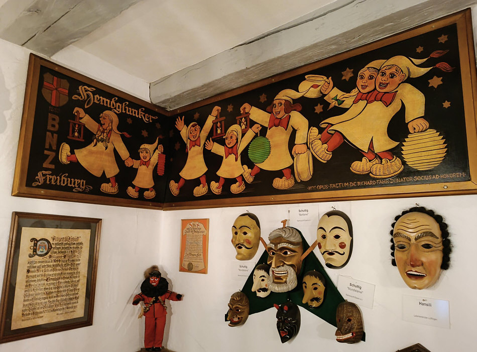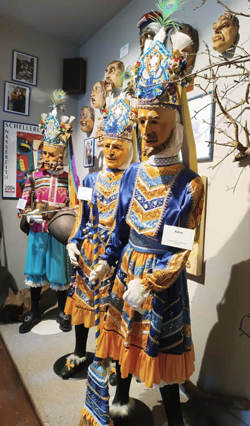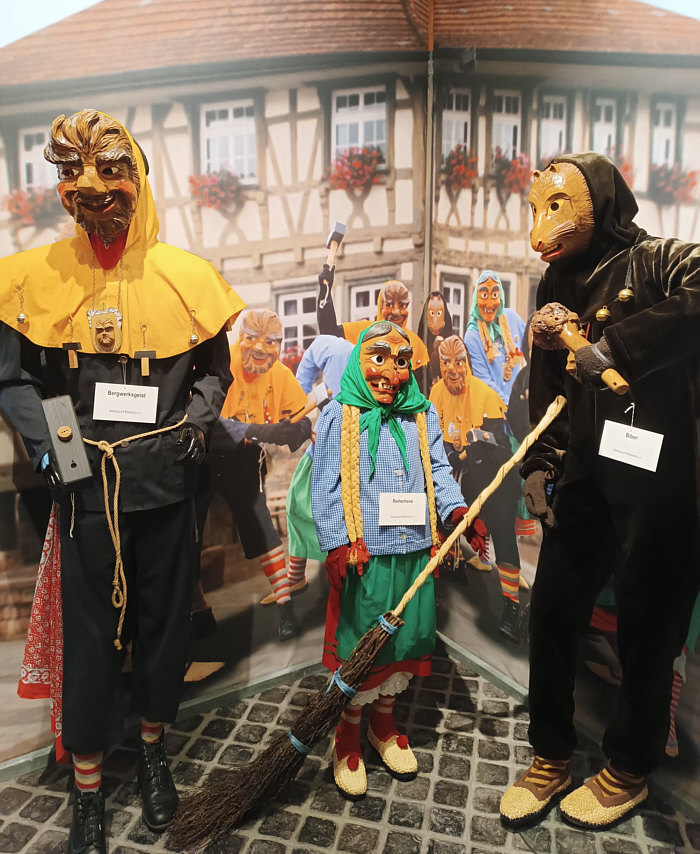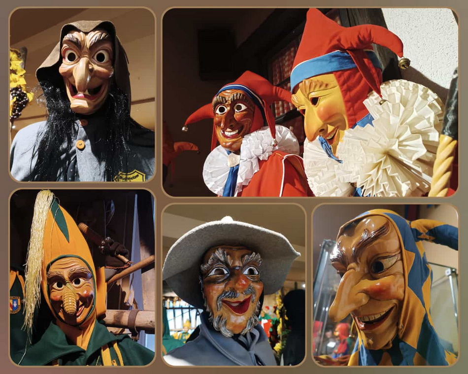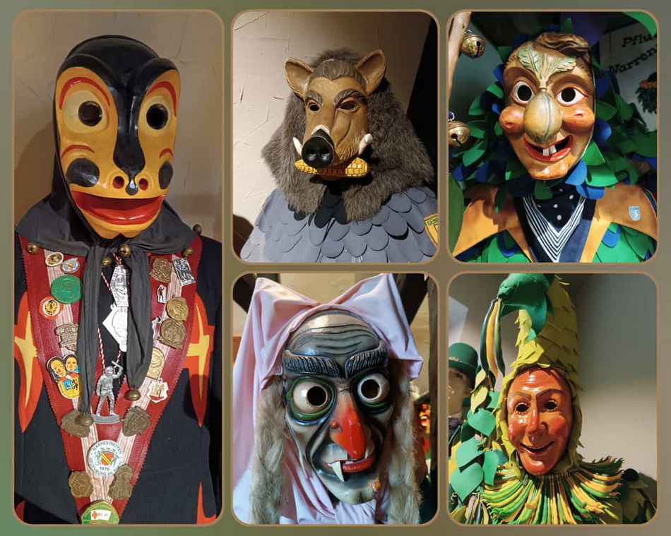 Heute sind wir hier ... ![]() ... bzw. Ina P. war hier und nimmt uns heute mit, damit wir auch sehen können, was sie gesehen hat. Wo sind wir hier überhaupt ? Weihnachtsbaum ? Narrenwappen ? Schauen wir mal genauer hin: ![]() Herrschaftshaus "Bettscholdt-Blumeneck" ... gut gut. ![]() Oberrh. Narrenschau ... scheint ja zum heutigen Tag zu passen ;). ![]() Welle-Bengel ... wer immer das ist. ![]() Verb Oberrh Narr ... ... was ausgeschrieben "Verband Oberrheinischer Narrenzünfte" heißt. Okay ... und nun ? Nehmen wir an einer Faschingssitzung teil ? Aber keinesfalls ? Lernen wir den Vorsitzenden kennen ? Nein ? Gehts um das Haus, also um die Bausubstanz ? Auch nicht ? Was denn ? Wir gehen in eine Ausstellung ... hä ? Ja, genau ... ich lasse mal Ina P. erzählen: Vor ein paar Tagen waren wir im Museum des VON (Verband Oberrheinischer Narrenzünfte) in Kenzingen. Der Verband wurde 1937 von 7 Zünften aus der Umgebung gegründet. Der VON hat heute 80 Mitgliedszünfte und ist in 6 Vogteien gegliedert. Ziel des Verbandes ist die Erhaltung und Pflege alter fasnächtlicher Bräuche. Die "Oberrheinische Narrenschau" in Kenzingen wurde 1976 eröffnet und 1979 sowie 1984 erweitert. Die Narrenschau in Kenzingen befindet sich in einem historischen Gebäude der traditionellen Üsenbergstadt, die 1249 gegründet wurde. Auf 5 Etagen werden über 300 Narrenfiguren in ihrem Häs, dem alemannischen Narrengewand, und über 600 Masken, Larven und Schemen, welche kunstvoll geschnitzt sind, vorgestellt. Sammlungen von fasnächtlichen Orden und Emblemen, Urkunden, Glasmalereien, Plaketten, Puppen und Gemälde runden die Narrenschau ab. Im Erdgeschoss ![]() Hier findet man die Vogtei (Ortsbezeichnung, früher nannte man so einen Gerichtsbezirk) Nördlicher Breisgau/Elztal. In dem alten, früher vorderösterreichischen Gebiet nördlich von Freiburg finden sich in vielen Orten des Elztals bis zu den Schwarzwaldhöhen und in der alten Narrenstadt Kenzingen sogenannte Häsfiguren, die für die Landschaft repräsantiv sind. Als Häs wird hier bei uns das Narrenkostüm bezeichnet, welches aus einem vollständig handgearbeiteten Narrenkleid, sowie einer meist aus Holz geschnitzten Maske, oft auch Larve genannt, besteht. ![]() Ein "Kleebolle" ... ein blühender Klee. ![]() Biberacher Fasent mit Bergwerksgeist, Reiherhexe und Biber. ![]() Schuttig aus Elzach (mit Schneckenhäuschen) ![]() ![]() 1. Obergeschoss: ![]() Hier ist die Vogtei Ortenau. Nördlich des Breisgaus schließt sich die Ortenau an, eine Landschaft in der zahlreiche alte Zünfte die Fasnet seit Jahrhunderten begingen und junge Zünfte brauchtumsgerecht auftreten. Zahlreiche Hexenzünfte stellen sich gemeinsam in einem Raum vor. Ebenfalls auf diesem Stockwerk vertreten ist die Brauchfasnet des Landes Tirol. ![]() Eine Selbacher Eule. ![]() ![]() ![]() Masken aus Tirol. ![]() Im Hexenzimmer. 2. + 3. Obergeschoss: ![]() ![]() ![]() Hier findet man zwei Vogteien. Die Vogtei Mittlerer und Südlicher Breisgau sowie die Vogtei Hochschwarzwald. Im Hochschwarzwald gibt es zahlreiche Orte mit langer fasnächtlicher Tradition, die eine urige Fasnet pflegen und bewahren. In Gemeinden "hoch obe uf em Wald" hat die Fasnet einen hohen Stellenwert. 4. Obergeschoss: ![]() Vogtei Dreiländereck. Das Dreiländereck ist die mitgliederstärkste Vogtei. Entlang des Rheins von Istein bis Rheinfelden und im Wiesental entwickelte sich eine Fasnet, die stark von schweizerischen Elementen geprägt ist und in ihrer Gestaltungsform von den anderen Vogteien abweicht. Guggemusiken und Waggis prägen die fasnächtliche Szene der "Hebel-Alemannen". Nicht große Zünfte, sondern viele örtliche kleine "Fasnachtscliquen" dominieren in der Region. Im Keller: ![]() Hier ist die Vogtei Freiburg. Die Freiburger Fasnet wurde erstmals im Jahre 1283 erwähnt und hat eine alte Tradition, die sich im Laufe der Jahrhunderte wandelte. Die 1934 gegründete Breisgauer Narrenzunft hat 34 Narrennester (Zünfte). Im Keller ist ein original gepflasterter Boden, welcher dem Freiburger Rathausplatz nachempfunden wurde. Ebenfalls im Keller befindet sich die "Hockstube" mit tollen geschnitzten Bänken und Tischen zum gemütlichen zusammenhocken. ![]() Oben: Hemdglunker (= Nachthemden und Schlafkappen) Umzug ![]() Glasfenster mit verschiedenen Schallmeien. Es grüßt Euch die Ina P. ... ![]() ... die hier eine Basler Larve (in Basel heißen die Masken Larven) trägt. Man sieht nicht allzuviel und wenn man so eine Maske mal 3-4 Stunden trägt, dann muss man schon ein starkes Genick haben. Aber es war toll, mal so eine Maske getragen zu haben. |