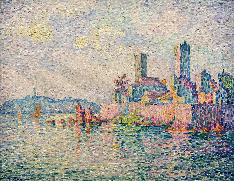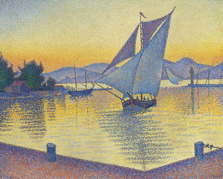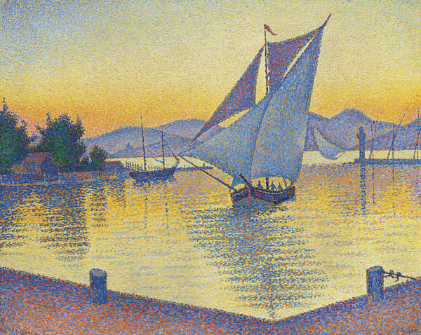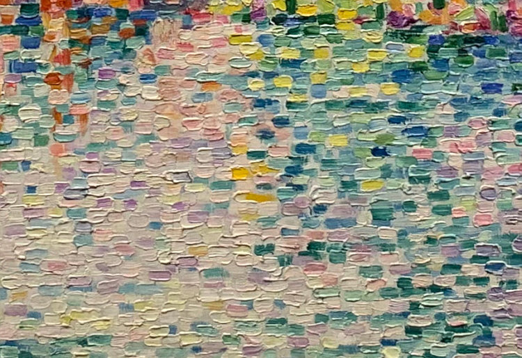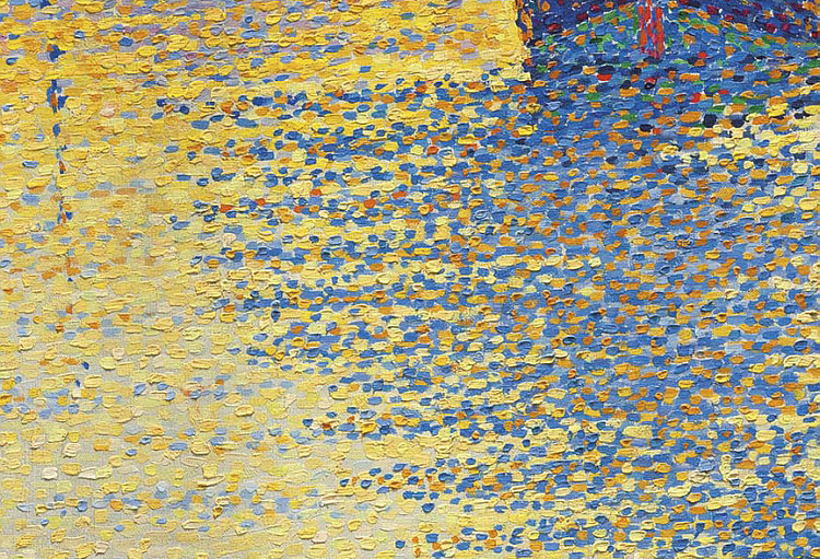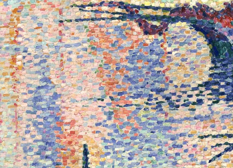 Viele kleine einzelne Farbpunkte ... ... ergeben ein großes Ganzes. 1884 haben sich zwei Maler getroffen und eine neue Art der Malerei entwickelt ... Georges Seurat und Paul Signac. Um den Letzteren geht es heute. Für diese neue Malerei machten sie sich neue wissenschaftliche Entdeckungen der Farbtheorie zu Nutze und setzten Pigmente der reinen Farbe in zahllosen Pünktchen unvermittelt nebeneinander. Im Unterschied zu den Impressionisten mischten sie die Farbe nicht mehr auf der Palette oder auf der Leinwand, sondern überließen dies dem Auge des Betrachters. Die Leuchtkraft dieser nicht vermischten, ungetrübten Farbe bleibt dadurch optimal erhalten. Der Gesamt-Farbeindruck einer Fläche ergibt sich erst im Auge des Betrachters und aus einer gewissen Entfernung. Durch optische Verschmelzung und additive Farbmischung formen sich die Farbpunkte zu Gestalten. Das sind Bilder, die von nahem betrachtet nur farbige Punkte sind und je weiter man weggeht, desto mehr werden sie zum Bild. Fünf Beispiele: Bild 1 - Öl auf Leinwand, 66x82 cm groß ![]() ![]() ![]() Bild 2 - Öl auf Leinwand, 131 x 161 cm groß ![]() ![]() ![]() Bild 3 - Öl auf Leinwand, 65 x 81 cm groß ![]() ![]() ![]() Nummer 4 - Öl auf Leinwand, 73 x 92 cm groß ![]() ![]() ![]() Nummer 5 - Graphit und Tinte auf Japanpapier, nur 22 x 26 cm groß ![]() ![]() ![]() Paul Signac und seine Bilder im Stil des Pointillismus. |