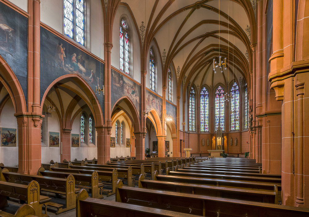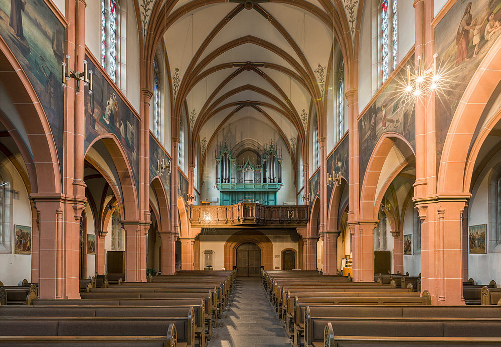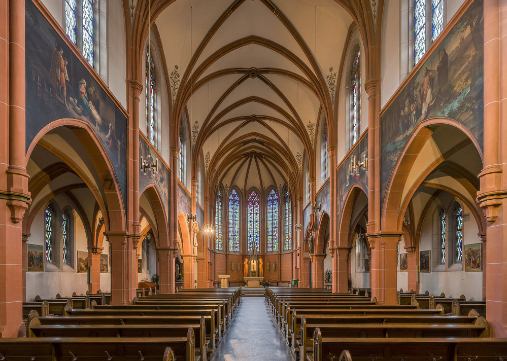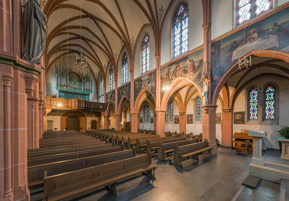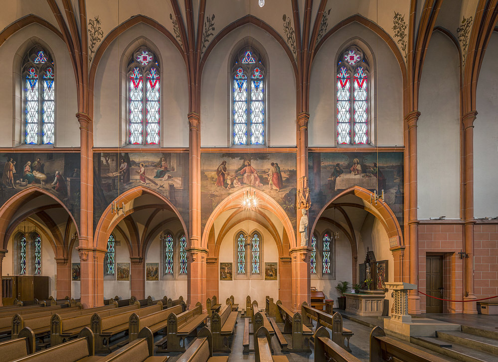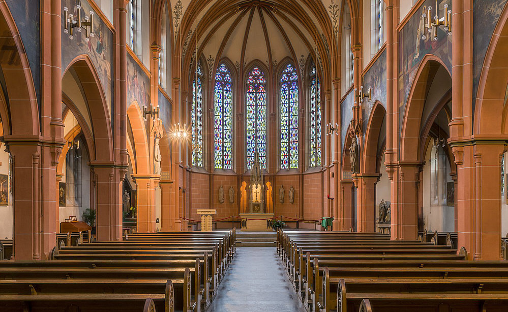 Wir sind in Frankfurt-Rödelheim. 1545 führte dort Graf Magnus von Solms-Rödelheim die Reformation ein. Wenn auch nicht ganz so streng wie in anderen Herrschaften, wurde auf Dauer doch den Katholiken das Bleiben unmöglich gemacht. Und so wanderten diese nach Frankfurt, Sossenheim oder Höchst aus. Die Cyriakuskirche in Rödelheim wird seitdem von der evangelischen Kirchengemeinde genutzt. 1801 gewährte Graf Vollrath zu Solms-Rödelheim den hiesigen Katholiken das Recht, privaten Gottesdienst halten zu dürfen. Die kleine Kirchengemeinde umfasste 38 Familien mit 105 Personen. Im Jahr 1819 wurde eine alte Gerberei erworben und zu einer kleinen Kirche umgebaut. Reiche katholische Kaufleute aus Frankfurt siedelten ihre Landsitze weit draußen vor den Toren der Stadt in Rödelheim an. Sie spendeten einen Fonds, dessen Erträge die Besoldung eines ersten Pfarrers sicherstellen sollte. Nach langwierigem Schriftwechsel mit dem Bischöflichen Ordinariat in Mainz und den staatlichen Stellen konnte 1842 die katholische Pfarrgemeinde in Rödelheim errichtet werden. Zu ihr gehörten 423 Katholiken. Die Gerberei-Kirche wurde im Lauf der Jahre zu klein und baufällig. So wurde ein Kirchenbauverein gegründet. Seine Bemühungen und eine Sammlung im deutschsprachigen Raum Europas zugunsten des Hl. Antonius von Rödelheim erlaubte 1892 die Grundsteinlegung und 1894 die Einweihung eines neugotischen Kirchengebäudes. Dieses wurde 1944 bei zwei Luftangriffen durch Fliegerbomben weitgehend zerstört. Aber es gründete sich nach dem Krieg ein neuer Kirchenbauverein und so wurde nach und nach das Gebäude wieder aufgebaut. ![]() Nach dem II. Vatikanischen Konzil wurde der Altarraum umgestaltet. Die mehrfach renovierte Kirche steht unter Denkmalschutz. Sie ist im Innenraum mit Wandbildern im Nazarener-Stil geschmückt. ![]() ![]() ![]() ![]() ![]() ![]() Willkommen in der Sonntagskirche von Seelenfarben :)). Deine Gedanken zur Kirche und zum Kircheninnenraum ? |