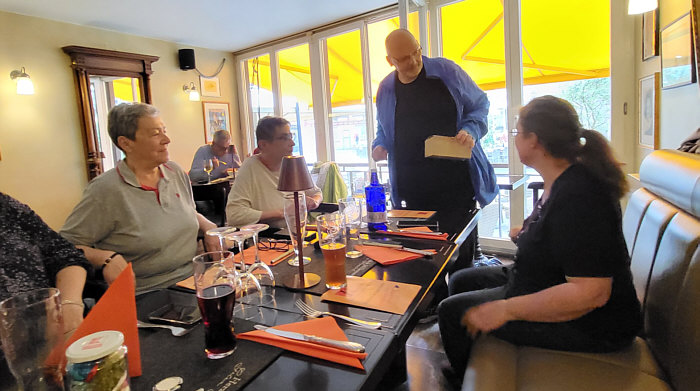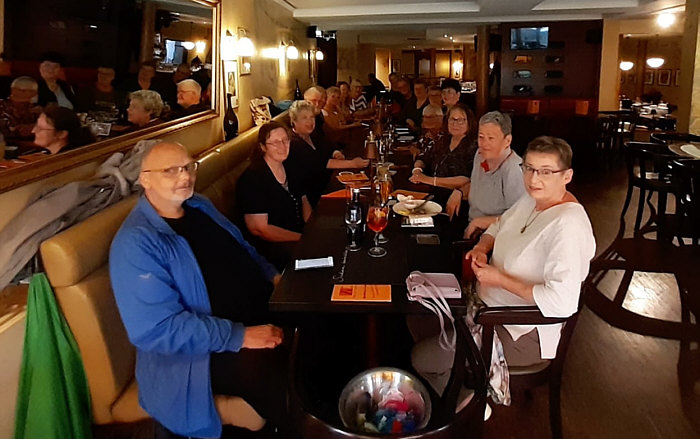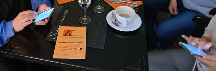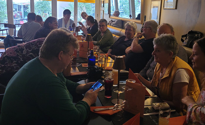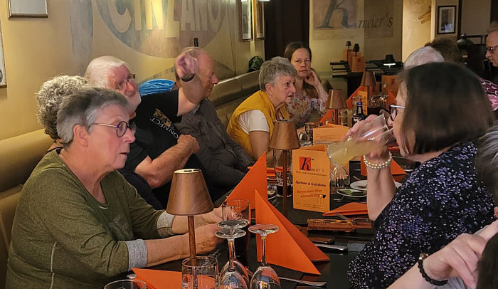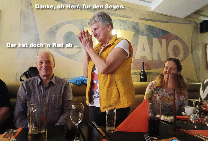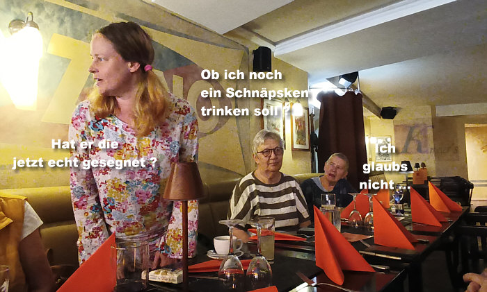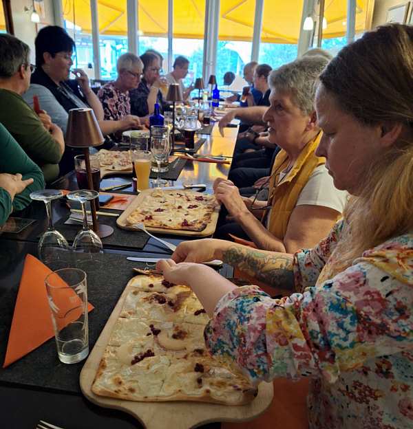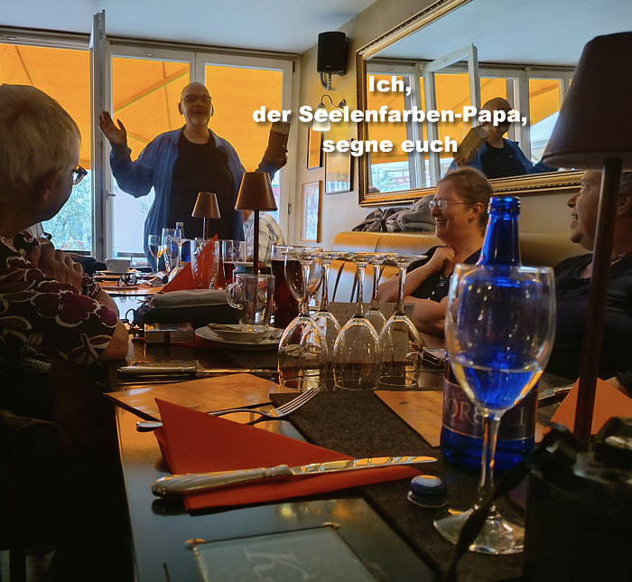 Seelenfarben-Treffen, Folge 3 Am Ende von Folge 2 hatte ich Euch weitere zwei Folgen versprochen und dass es in der nächste Folge "Details, Essen, Zimmer, Beisammensein" zu sehen sein werden ... und das ist heute der Fall. Fotos vom ![]() Ich fange mit diesem kleinen Glücksstein an ... ![]() ... Ina P's Freundin hatte einige davon bemalt, die an die Teilnehmer als Glückssteinchen verschenkt wurden. Hier ... ![]() ... haben wir nicht gesessen ... aber hier: ![]() Kurz bevor die Seelenfärbler eingetrudelt sind. ![]() ![]() ![]() ![]() Hier ... ![]() ... hab ich gerade Pats Knöpfe in der Hand. Dann wurde es stiller ... das Essen kam: ![]() Es gab ... ![]() Flammkuchen ![]() Salat ![]() Tagliatelle mit Pfifferlingen ![]() Frankfurter grüne Soße und die besten Bratkartoffeln der Welt. Nicht direkt dabei war ... ![]() ... die Bärenbande ... die hat traditionell im Auto gewartet. Ebenfalls gewartet haben diese tollen Zimmer auf Gitta und Karin v.N.: ![]() ![]() Das muss ich in groß zeigen: ![]() Zurück zum Treffen ... nach dem Essen waren viele ziemlich blau ... ![]() ![]() ![]() ![]() ... aber durchweg gut drauf. Weil sie alle noch den Höhepunkt in Erinnerung hatten. Denn kurz vor der Segnung haben wir gemeinsam auf das Handy geschaut und uns alle eine halbe Stunde lang die neuen Updates von Seelenfarben angeschaut. Wie bei jedem Treffen eben *gg*. ![]() Danach kam der Höhepunkt des Treffens: ![]() ![]() ![]() In diesem Sinne zeige ich das nächste Mal die Portraitfotos :)). |