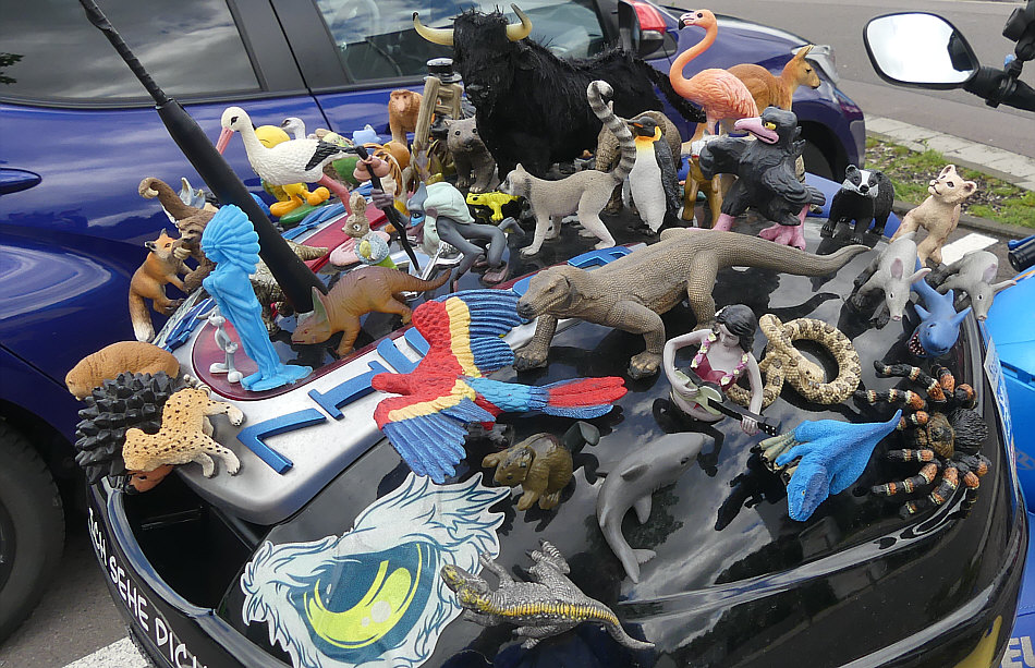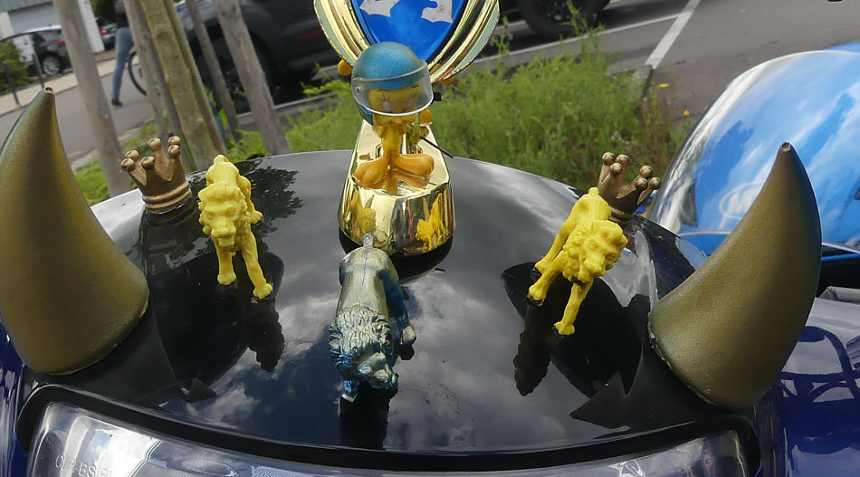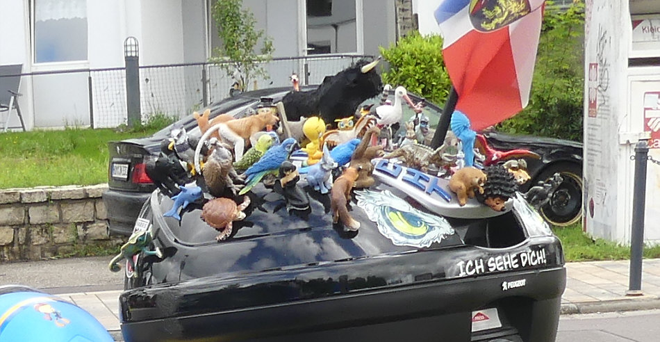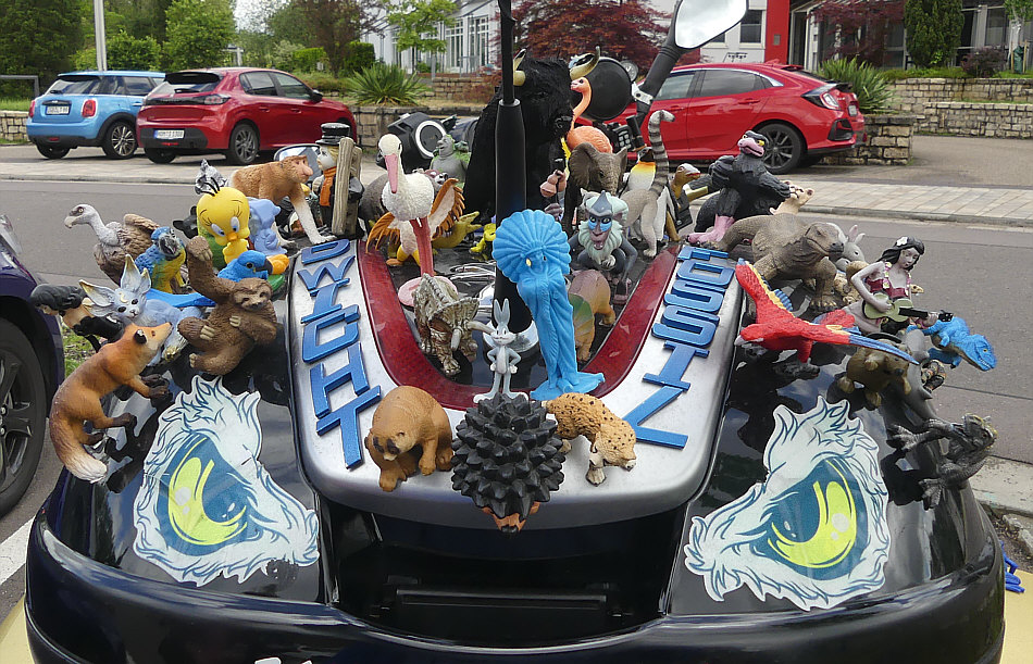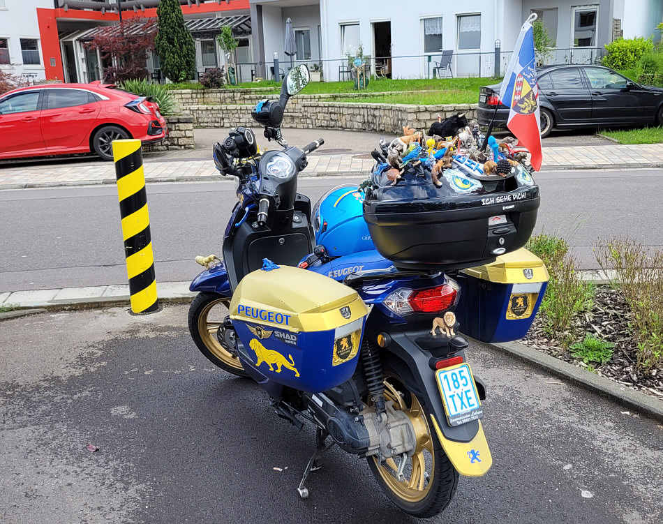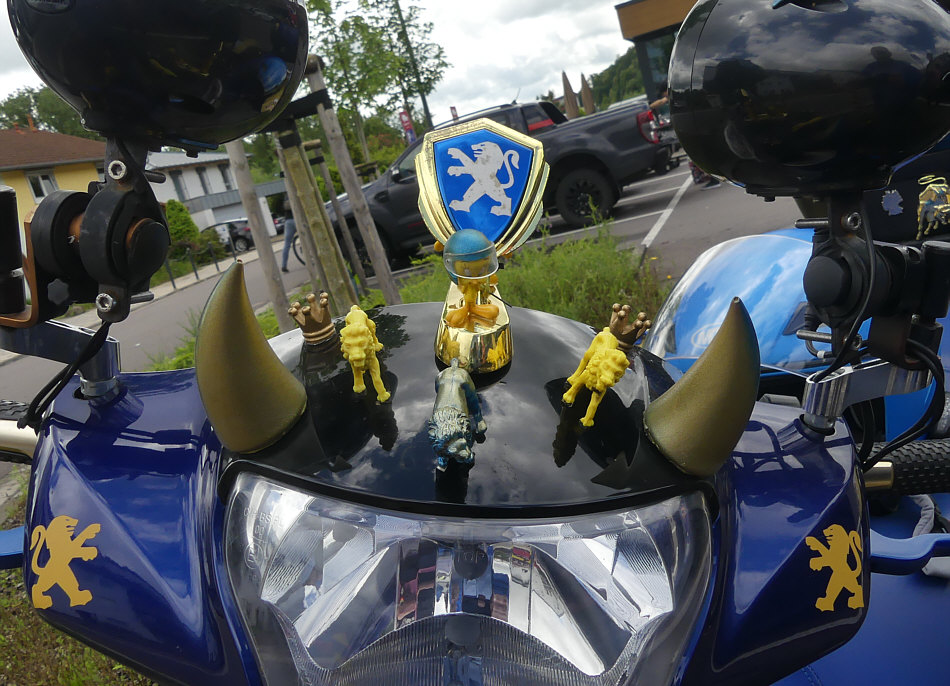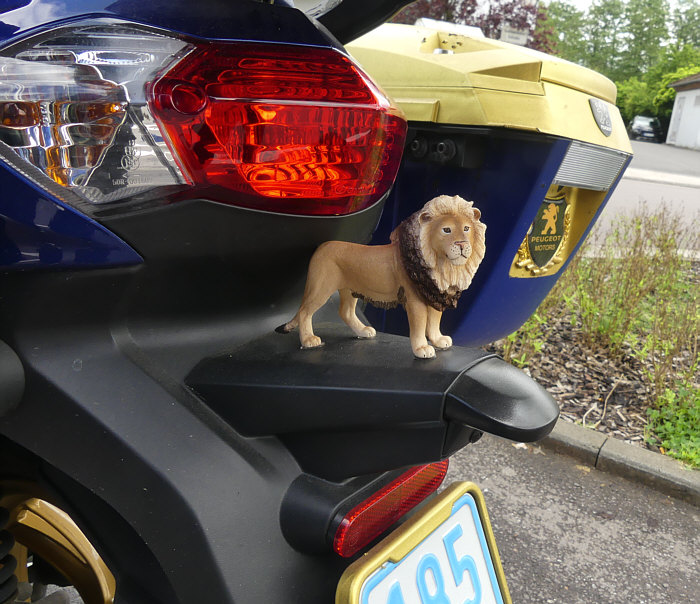 Ihr erinnert Euch sicher an dieses Bild ... ![]() ... das war als Rätselbild im Lichtblick. Das war die Auflösung ... ![]() ![]() ... und hier war der Löwe zu finden: ![]() Direkt über dem Nummernschild steht der Löwe. Und wie man jetzt schon sieht, ist da noch viel mehr an und auf diesem Zweirad zu finden. ![]() ![]() Von vorne: ![]() ![]() Und nun kommen wir zum hinteren Motorradkoffer: ![]() Der ist ein paar Blicke mehr wert: ![]() ![]() ![]() Die Arche Noah ist startbereit ;)). |