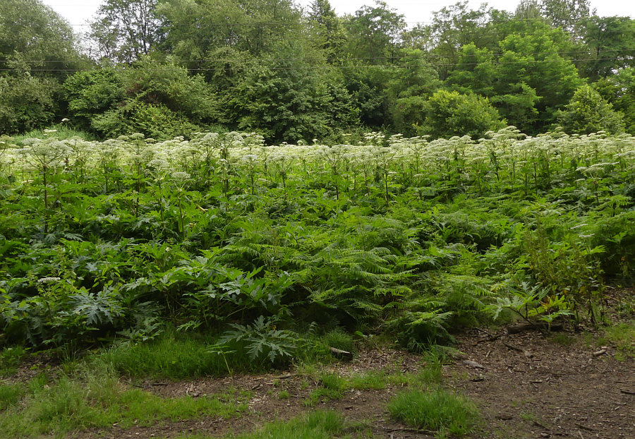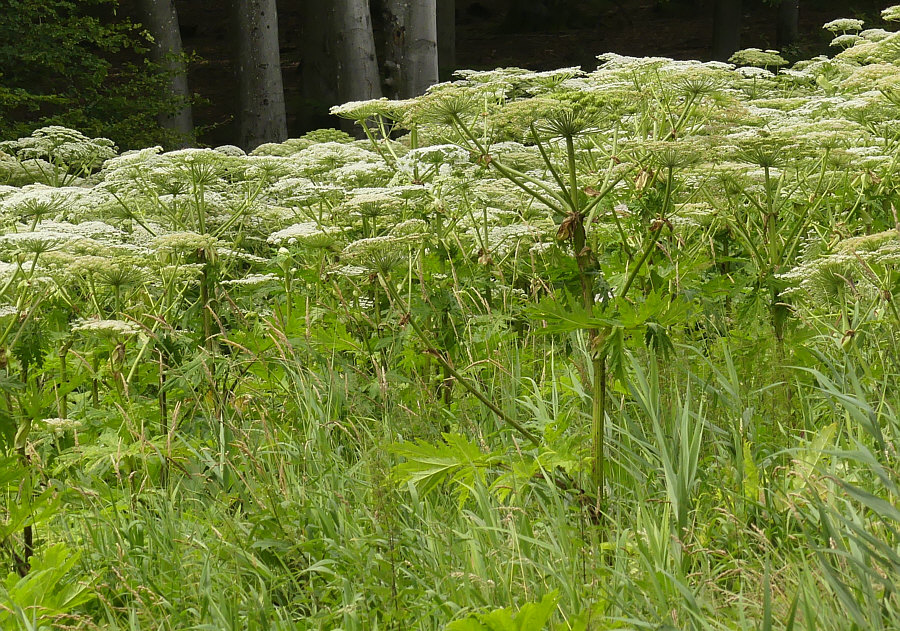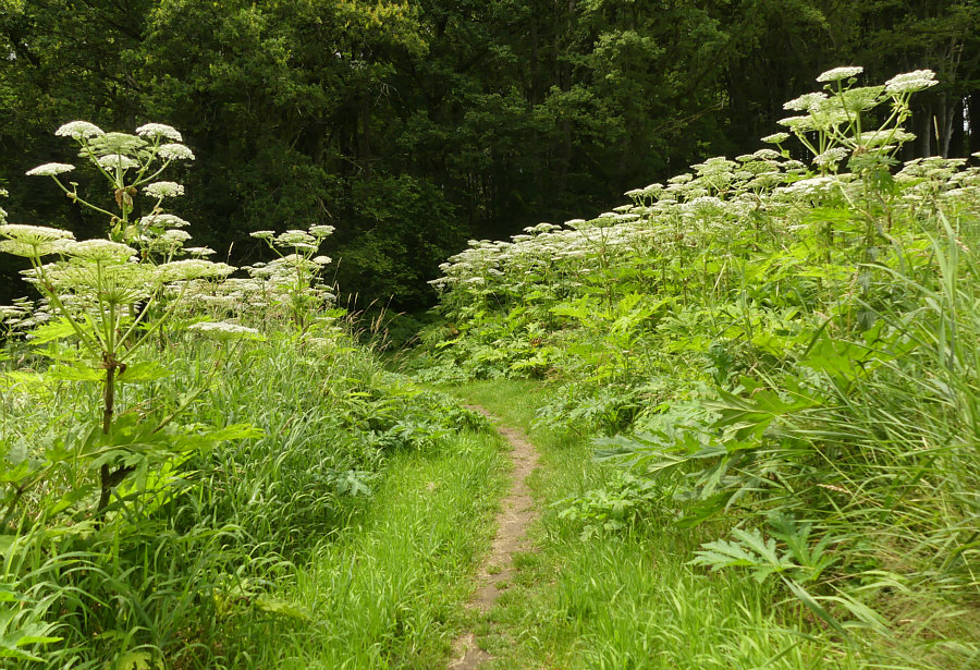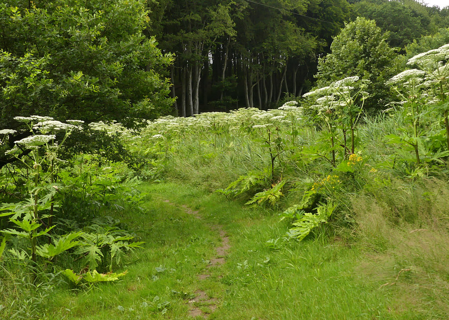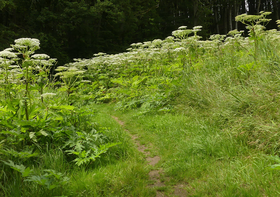 Bilder vom Spaziergang letzten Freitag ... ... zuerst war es ein Guckmalda: ![]() ... und ein "hey, hier wächst der Riesen-Bärenklau. Da könnte man doch mal stehen bleiben und fotografieren: ![]() ![]() ![]() ![]() Und danach weiter gehen ... ![]() ... auch hier wächst der Bärenklau fast bis zum Weg. Doch wir ahnten nicht, was hinter der nächsten Ecke zu sehen sein wird. ![]() ![]() ![]() Ein ganzer Riesen-Bärenklau-Wald. Die Pflanzen sind riesig ... an die drei Meter. ![]() Der Pfad, der durch diesen Wald führt ist schmal ... ![]() ... und an einer Stelle ... ![]() ... stehen die Pflanzen so dicht, dass man gerade so vorbei kommt, ohne sie zu berühren. Dazu muss man wissen, dass der Bären-Klau ganz böse Hautreizungen verursacht. In Verbindung mit Tageslicht kann er bei Menschen (und anderen Säugetieren) zu schmerzhaften Quaddeln und Blasen führen, die schwer heilen und wie Verbrennungen erscheinen. Es wird deshalb empfohlen, beim Umgang mit der Pflanze vollständige Schutzkleidung zu tragen, zu der auch ein Gesichtsschutz gehört. Unter Umständen können Reaktionen auch erst wenige Tage später durch dann auf die betroffene Haut einstrahlendes Sonnenlicht ausgelöst werden. An heißen Tagen werden zudem die Furanocumarine von der Pflanze an die Umgebung abgegeben und es kann bereits bei einem längeren Aufenthalt unmittelbar neben den Pflanzen zu den oben beschriebenen Erscheinungen oder auch zu Atemnot kommen. Und hier läuft man ungeschützt an so einem Wald vorbei. Okay, wenn man die Pflanze nicht berührt, dann passiert nichts. Und länger hält man sich ja auch nicht auf. Aber was, wenn Kinder oder Hunde dabei sind ? Das ist ja ein ganz normaler Waldweg hier. Und das sind ja nicht ein paar einzelne Pflanzen hier ... ![]() ![]() ... das ist ein dichter Wald ... ![]() ... der immer größer wird. Sowas hatte ich bis dato auch noch nicht gesehen und hätte auch nicht gedacht, dass es Plätze gibt, wo diese Pflanze in dieser Dichte und Menge wächst. |