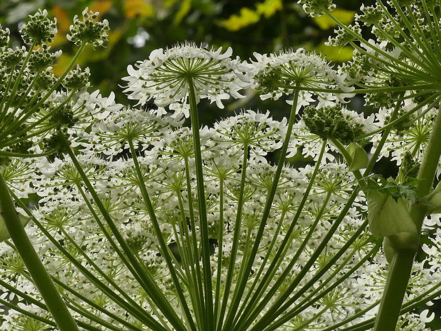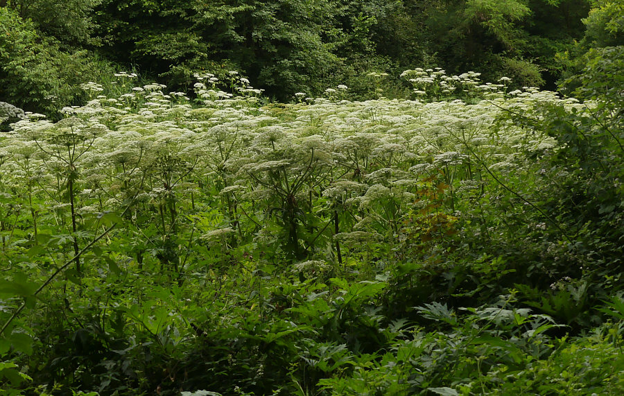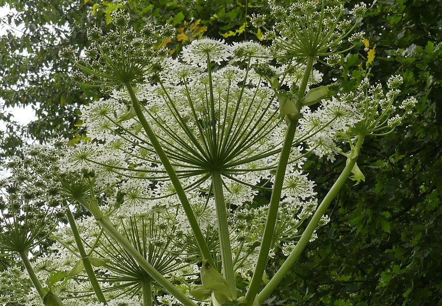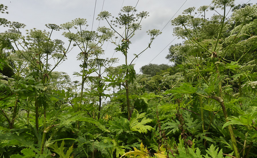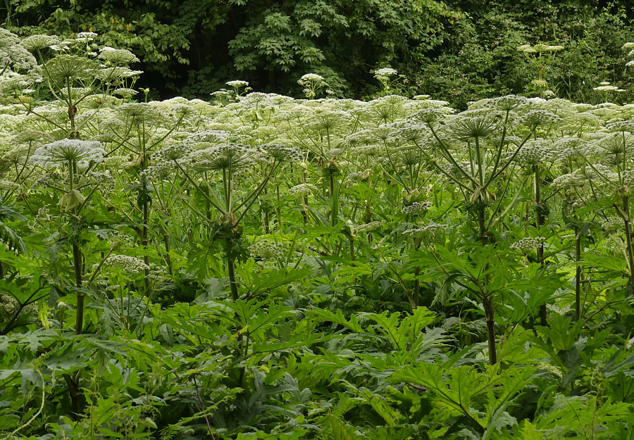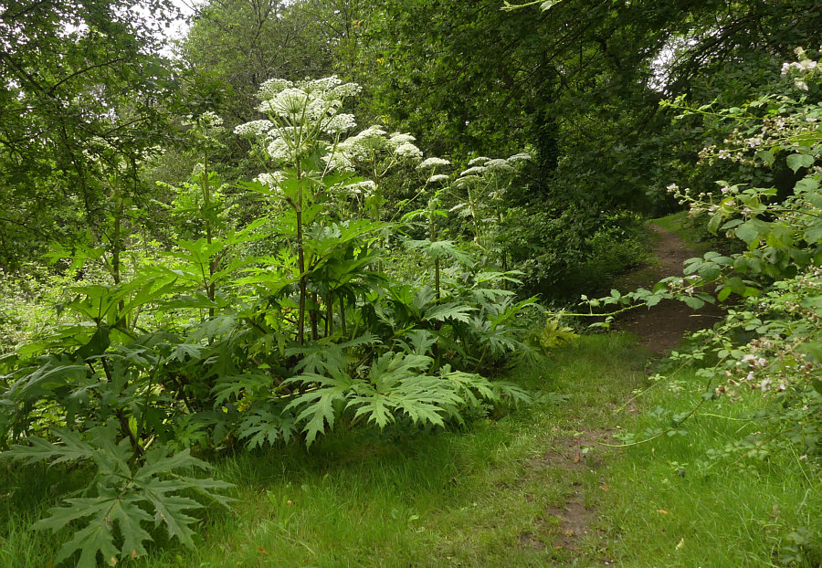 Bilder vom Spaziergang letzten Freitag ... ... zuerst war es ein Guckmalda: ![]() ... und ein "hey, hier wächst der Riesen-Bärenklau. Da könnte man doch mal stehen bleiben und fotografieren: ![]() ![]() ![]() ![]() Und danach weiter gehen ... ![]() ... auch hier wächst der Bärenklau fast bis zum Weg. Doch wir ahnten nicht, was hinter der nächsten Ecke zu sehen sein wird. ![]() ![]() ![]() Ein ganzer Riesen-Bärenklau-Wald. Die Pflanzen sind riesig ... an die drei Meter. ![]() Der Pfad, der durch diesen Wald führt ist schmal ... ![]() ... und an einer Stelle ... ![]() ... stehen die Pflanzen so dicht, dass man gerade so vorbei kommt, ohne sie zu berühren. Dazu muss man wissen, dass der Bären-Klau ganz böse Hautreizungen verursacht. In Verbindung mit Tageslicht kann er bei Menschen (und anderen Säugetieren) zu schmerzhaften Quaddeln und Blasen führen, die schwer heilen und wie Verbrennungen erscheinen. Es wird deshalb empfohlen, beim Umgang mit der Pflanze vollständige Schutzkleidung zu tragen, zu der auch ein Gesichtsschutz gehört. Unter Umständen können Reaktionen auch erst wenige Tage später durch dann auf die betroffene Haut einstrahlendes Sonnenlicht ausgelöst werden. An heißen Tagen werden zudem die Furanocumarine von der Pflanze an die Umgebung abgegeben und es kann bereits bei einem längeren Aufenthalt unmittelbar neben den Pflanzen zu den oben beschriebenen Erscheinungen oder auch zu Atemnot kommen. Und hier läuft man ungeschützt an so einem Wald vorbei. Okay, wenn man die Pflanze nicht berührt, dann passiert nichts. Und länger hält man sich ja auch nicht auf. Aber was, wenn Kinder oder Hunde dabei sind ? Das ist ja ein ganz normaler Waldweg hier. Und das sind ja nicht ein paar einzelne Pflanzen hier ... ![]() ![]() ... das ist ein dichter Wald ... ![]() ... der immer größer wird. Sowas hatte ich bis dato auch noch nicht gesehen und hätte auch nicht gedacht, dass es Plätze gibt, wo diese Pflanze in dieser Dichte und Menge wächst. |