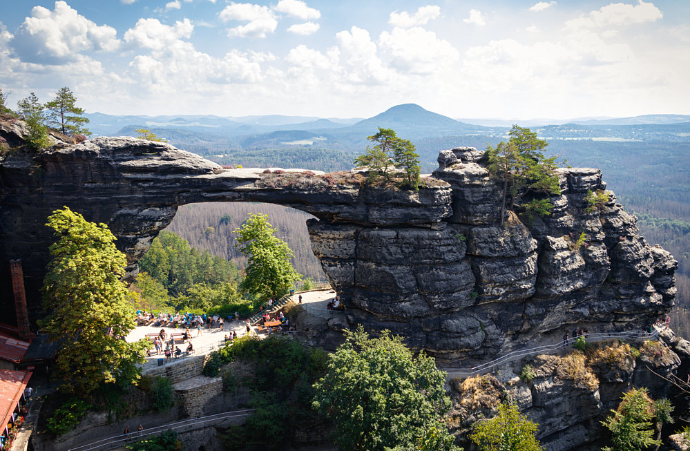 ![]() Das ist das Prebischtor (Pravčická brána) in der Böhmischen Schweiz. Dieses Felsgebilde ist die größte natürliche Sandstein-Felsbrücke Europas. Spannweite 26,5 Meter, lichte Höhe 16, maximale Breite 8 und Torbogenstärke von 3 Metern. (zurück zur Kirche ... bitte hier klicken) |