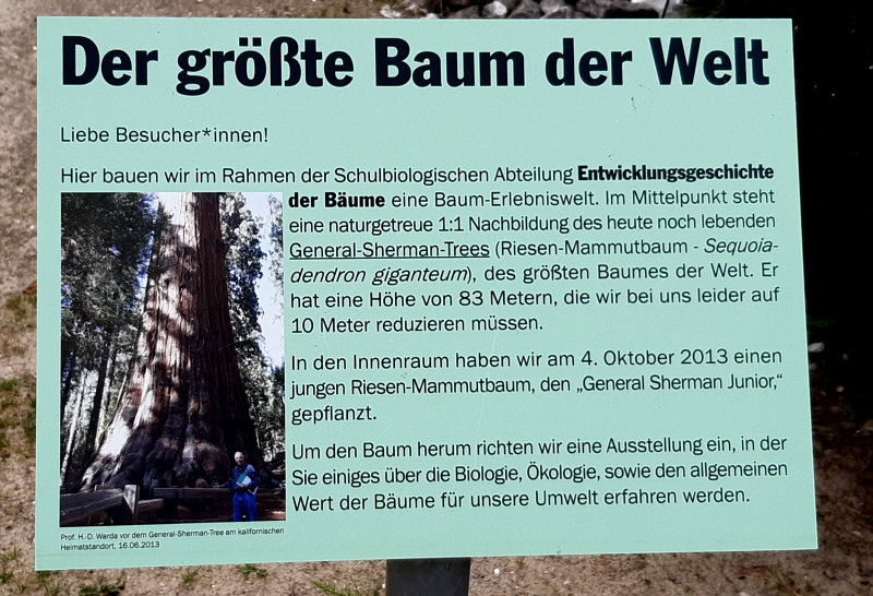 Gitta im Arboretum Teil 7 (Teil 1, Teil 2, Teil 3, Teil 4, Teil 5, Teil 6) ![]() Hier waren wir stehen geblieben: ![]() Wir sind ganz gespannt auf diesen Baum. ![]() Wir stehen vor ... ![]() ... einem nachgebildeten Stamm des Riesen-Mammutbaumes. Auf der anderen Seite gibt es einen Eingang ... ![]() ... und da schauen wir jetzt rein. ![]() ![]() Hier wächst nun im Inneren des nachgebildeten Stammes ein "echter" Riesen-Mammutbaum" in die Höhe und hat oben schon eine mächtige Krone gebildet. ![]() Unser Weg führt nun weiter ... vorbei an einem Moorbiotop und wir kommen zur anderen Uferseite vom Arboretum-See. Dort, wo nun die Seerosen- und Lotusblüte beginnt. ![]() ![]() ![]() ![]() ![]() ![]() ![]() ![]() ![]() ![]() ![]() Wir dürfen auch eine große Kunst-Libelle bewundern. ![]() Ein Blick zurück über den See zum großen Mammutbaum und dann geht es weiter. [ wird fortgesetzt ] |