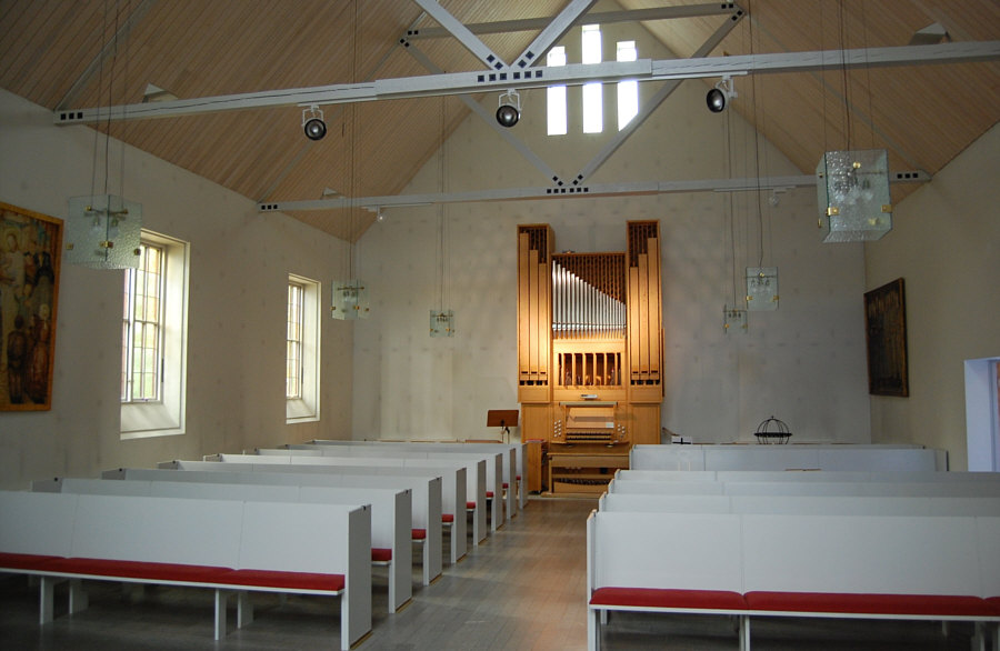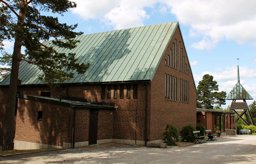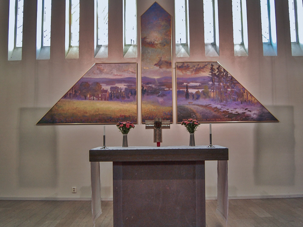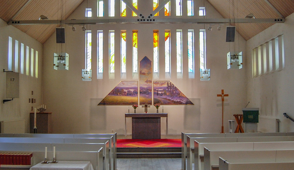 Wir sind heute in der Stadt Vaxjö im Süden Schwedens. Dort steht die Högstorps Kyrka. Eine Kirche aus Beton mit Wänden, die mit dunkelroten Fassadenziegeln verkleidet sind. ![]() Neben der Kirche steht das Gemeindezentrum. Von der anderen Seite ... ![]() ... sieht man hinter der Kirche den freistehenden Glockenturm mit Kupferhaube. Wir gehen rein und schauen in Richtung Orgel: ![]() Und nun der klassische Sonntagskirchenblick: ![]() Wie nun ein ganz überraschendes Detail und Kunstwerk den Blick auf sich zieht und den Raum bestimmt. Auf dem Altarbild aus dem Jahr 1994 ... ![]() ... sind die vier Jahreszeiten zu sehen. Willkommen in der Sonntagskirche von Seelenfarben :)). Deine Gedanken zur Kirche und zum Kircheninnenraum ? |