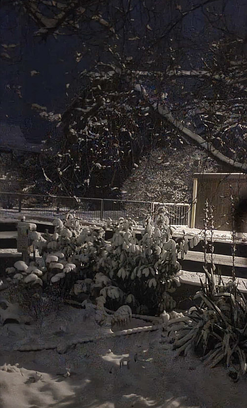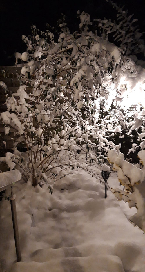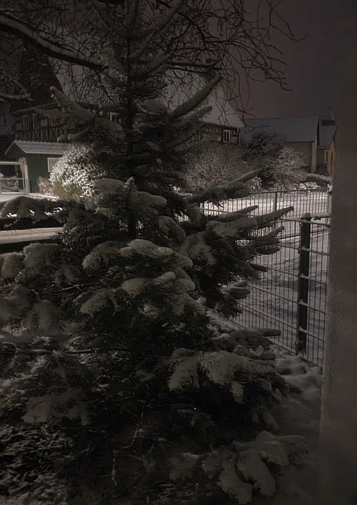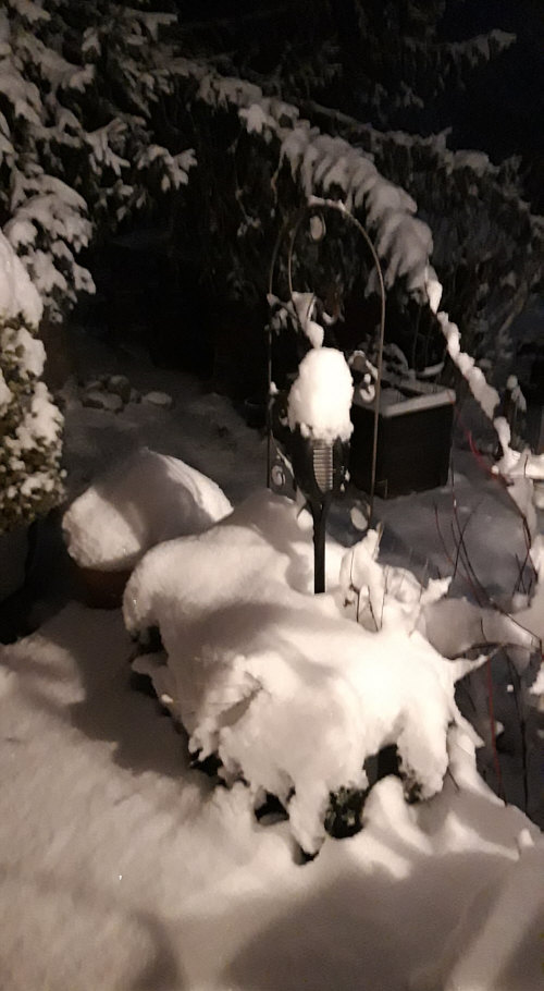 Nachtschnee Ja, okay, vielleicht nicht "in" der Nacht fotografiert, sondern einfach im Dunkeln ... aber ich wollte nicht Dunkelschnee schreiben ;). Ganz aktueller Schnee ... der jetzt noch liegt. Es ist ja an Orten Schnee gefallen, wo Schnee nicht unbedingt eine Selbstverständlichkeit ist. 3mal Seelenfärbler-Schnee Miss Greenworld schreibt: "Meine erste Runde um den Platz vor der Tür. Mit einer Tasse Kaffee in der Hand erkunde ich in Potsdam das Wetter, um für die Hunderunde richtig gekleidet zu sein. ![]() ![]() ![]() Carmen J. schreibt: "Die Fotos habe ich von meinem Fenster aus fotografiert. Sie zeigen meinen Garten, der Baum trug Weihnachten eine Beleuchtung. Die Zweige lagen so voll Schnee und der Schatten des Fahrrades hat mir so gefallen. Das Rad gehörte erst meiner Mutter, dann meinem Bruder und nun steht es in meinem Garten. Und die Zweige sahen nachts aus wie kleine Blüten. ![]() ![]() ![]() Konny schreibt: "Die Bilder habe ich morgens früh in Berlin auf unserer Terrasse gemacht. Es sind über Nacht 12 cm Neuschnee gefallen" ![]() ![]() ![]() ![]() |