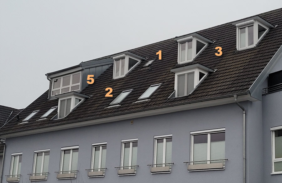 Nein ... viel mehr ... das sind Fenster und Gauben, die so unterschiedlich wie das Leben und wie die Menschen sind. Sowas in dieser Art hatte ich vorher noch nie gesehen. Ein Dach, in dem anscheinend jeder der Bewohner individuell entscheiden konnte, welche Art Fenster oder Gaube er haben will. Welcher Typ wärst du ? 1 ... das kleine Dachfenster 2 ... das normale Dachfenster 3 ... die normalen Gauben (die obere Reihe etwas größer) 4. ... die kleine Loggia 5. ... die große Gaube mit den drei Fenstern |