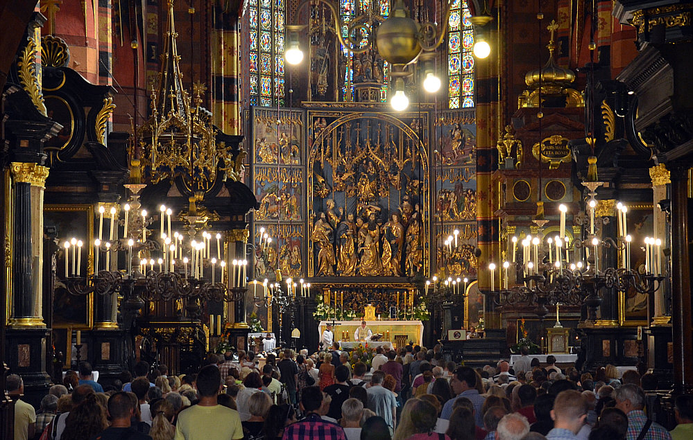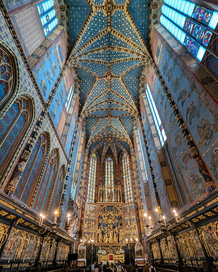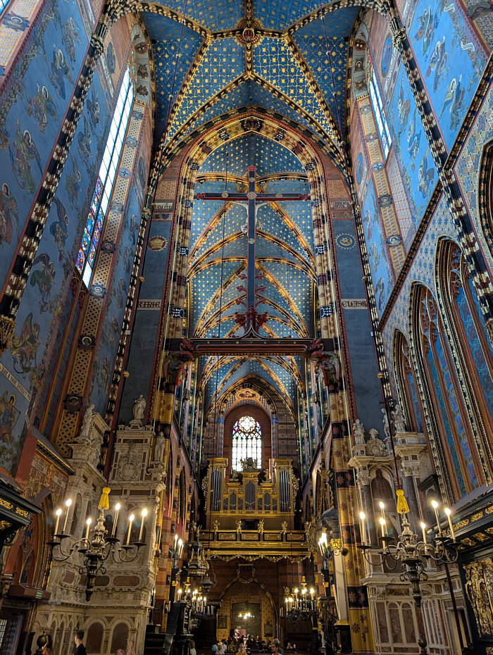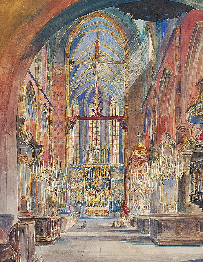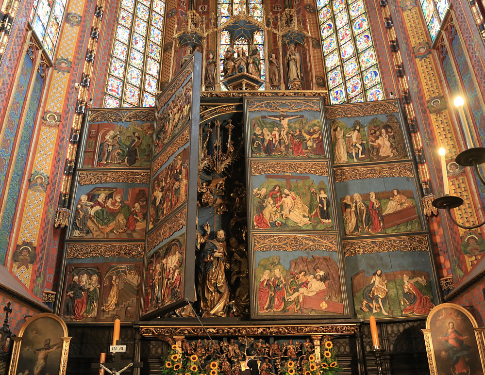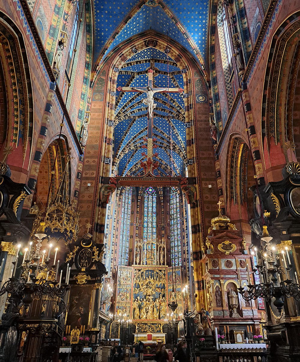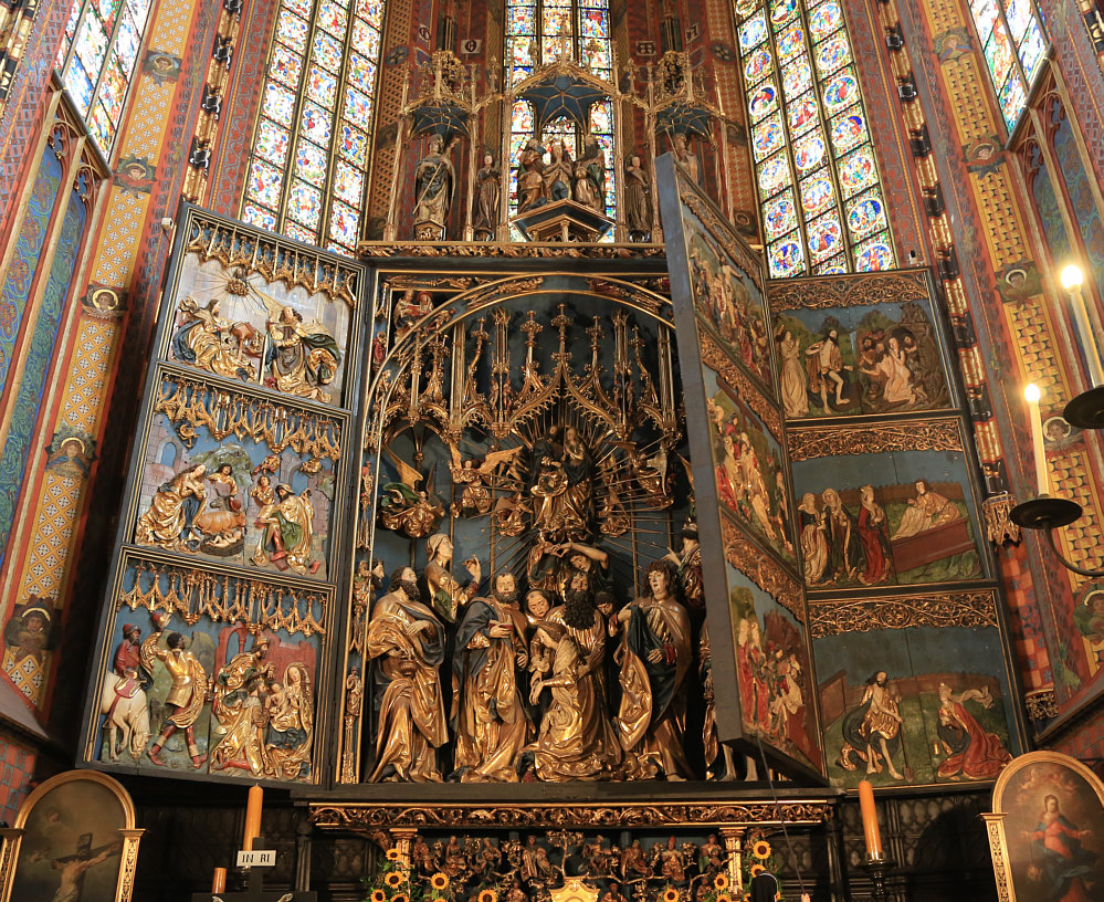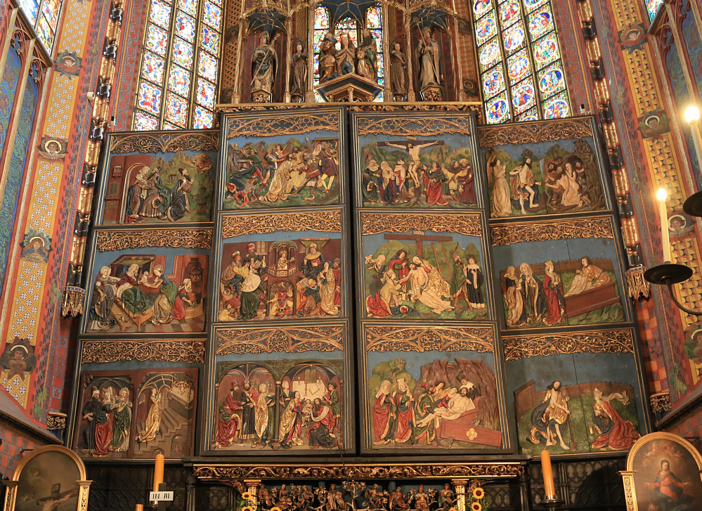Nehme ich eine fröhliche, bunte Sonntagskirche, weil Fasching ist und weil unser aller Herzen oft schwer sind und ein bisschen Heiterkeit freundlich begrüßen würden ? Nehme ich eine einfache Sonntagskirche, aus Ausgleich zur Närrischkeit oder weil zur aktuellen Lage keine andere Kirche passt ? Ich entscheide mich für eine Kirche, die ich vor zwei Wochen gesehen und die mich sehr beeindruckt hatte. Ich hatte sie bei einer Seelenfärblerin im Status gesehen und mich auf die Suche nach Infos und Bildern zur Kirche gemacht. Es war mir eine große Freude, diese schöne Kirche im Status zu entdecken und habe dann nachgeschaut ... bereits vor über 10 Jahren hatte ich einen Sonntagskirchenordner angelegt, wo auch diese Kirche zu finden ist ... ich war auch damals von ihr beeindruckt, hatte sie aber dennoch nie gezeigt. Ich will heute mal mit den Außenbildern anfangen: ![]() ![]() ![]() Erbaut wurde diese Kirche an Stelle einer romanischen Kirche aus den Jahren 1221–1222. Der Neubau fand vom Ende des 13. bis zum Beginn des 15. Jahrhunderts statt, als klassisches Beispiel gotischer Architektur mit dem Patrozinium "Himmelfahrt der seligen Jungfrau Maria". Die Marienkirche besitzt zwei unterschiedliche Türme, einen nördlicheren und höheren (81 m) mit spitzem Dach (mit Uhrglocke) und den etwas niedrigeren (69 m) südlichen Turm. Einer Sage nach sollen die Türme von zwei Brüdern in Konkurrenz erbaut worden sein. Während der ältere Bruder seinen Turm bereits fertiggestellt hatte, war sein jüngerer Bruder noch mit dem Bau beschäftigt. Aus Angst, sein Bruder könne einen höheren Turm bauen, erstach er ihn. Das Tatwerkzeug (Messer) ist bis heute an der Tuchhalle zu sehen. Seufz ... damals war so manches auch nicht besser als heute. Wenden wir uns lieber dem Kircheninneren zu ... zwei gemalte Bilder: ![]() Das sieht hier noch ziemlich düster aus ... das Bild ist auch von 1858. Ein 1921 gemaltes Bild ... ![]() ... ist da schon viel freundlicher. Die Kirche war ja ursprünglich gotisch eingerichtet ... aber im 18. Jahrhundert wurde der Innenraum im spätbarocken Stil umgebaut ... alle 26 Altäre, Geräte, Möbel, Bänke und Gemälde wurden ersetzt. In den Jahren 1887–1891 wurde die Kirche erneut umgestaltet ... diesmal im neugotischen Stil. Und wieder gab es ein neues Design in der Kirche und diesen wunderbaren Sternenhimmel. ![]() ![]() Das ist der Blick nach hinten zur Orgel. Der Blick nach vorne geht natürlich zum Altar ... ![]() ... und dieser Altar ist, obwohl der Gesamteindruck ja schon sensationell ist, die größte Sehenswürdigkeit in dieser Kirche. Wo sind wir eigentlich ? In Krakau, in Polen ... das ist die Marienkirche. Dieser Hochaltar ist das erste gesicherte Werk des Bildschnitzers Veit Stoß und eines seiner Hauptwerke. Der 1489 eingeweihte spätgotische Wandelaltar besitzt einen Hauptschrein, zwei feststehende Außen- und zwei bewegliche Innenflügel. Der Schrein enthält annähernd vollplastische Figurengruppen, die einzelnen Flügel sind mit je drei Reliefs geschmückt. Die Schnitzarbeiten sind farbig gefasst und vergoldet. Thema des Altares ist die Verherrlichung Marias. Veit Stoß hatte 1477 wegen des Altars seinen Wohnsitz nach Krakau verlegt. Bis zu 500 Jahre alte Baumstämme waren erforderlich, um die größten Figuren schnitzen zu können. Da die dickeren Stämme für die Skulpturen des Hauptschreins vier bis fünf Jahre zur Trocknung benötigten, begann er seine Arbeit 1477 mit dem Schnitzen der flachen Holzreliefs der Flügel. Er vollendete den neuen farbig gefassten und vergoldeten Hochaltar im Jahre 1489. Während des 2. Weltkrieges wurde der Hochaltar Mühlmann beschlagnahmt und für das geplante "Führermuseum" in Linz als Beutekunst nach Großdeutschland verschleppt. Zum Schutz vor Bomben wurde er im Historischen Kunstbunker unter der Nürnberger Burg eingelagert. Nach Kriegsende wurde der Altar von der US-Army an die Stadt Krakau zurückgegeben, von 1946 bis 1950 konservatorisch behandelt und zunächst im Wawel-Schloss ausgestellt. 1957 brachte man den Altar wieder auf seinen ursprünglichen Platz in der Marienkirche zurück. Das ist die Schauseite des Altars: ![]() Das ist die "Alltagsseite", die geschlossene Schauseite. Der Altar ist 13 Meter hoch und 11 Meter und somit der größte spätgotische Schnitzaltar. Er beherrscht den Chorraum der Basilika. Zentrales Thema des Flügelaltars ist Tod, Himmelfahrt und Krönung Mariens. Es wird umrahmt von Geschichten und Motiven aus dem Leben von Maria und Jesus. Und nun öffnen wir mal langsam den Altar: ![]() ![]() ![]() Das ist jetzt die "Festtagsseite" des Altars mit ihren großflächigen Vergoldungen. Die bis zu 2,70 Meter hohen Schreinfiguren aus Lindenholz sind aus jeweils einem Stamm gefertigt. Ein solcher Festtag war Christi Himmelfahrt ... an diesem Tag ... ![]() ... war die Kirche gut besucht. Einen der Flügel zeige ich im Detail ... ![]() ... das ist "Mariä Verkündung". Zum Schluss noch die klassische Sonntagskirchenperspektive: ![]() Willkommen in der Sonntagskirche von Seelenfarben :)). Deine Gedanken zur Kirche und zum Kircheninnenraum ? |