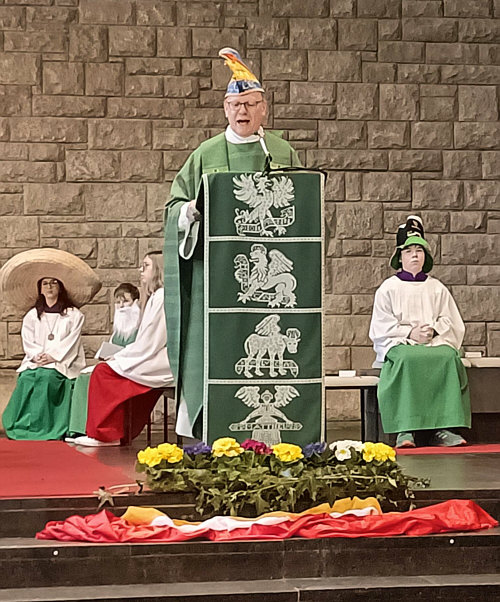 ![]() Der katholische Pfarrer und Dekan Johannes Brandt bei seiner gestrigen Büttenrede in der Kirche. Christa schreibt dazu: "Das ist der Gemeindepfarrer ... er stammt aus dem Rheinland. Jedes Jahr hält er in einem ganz normalen Gottesdienst eine Karnevalspredigt. Alles in Reimform ... er bringt seine Botschaften auf den Punkt. Die Ministranten sind ebenfalls verkleidet. Nach dem Gottesdienst gibt es Krapfen und Kaffee vor der Kirche. Ich bin evangelisch, aber das lass ich mir nicht entgehen. Er ist auch schon auf einer öffentlichen Karnevalssitzung aufgetreten. Was er da sagt, ist natürlich Kritik an der Kirche ... Thema Frauen oder Politik, aber stets intelligent und fein geschliffen. Eppele Helau. Was dem anderen normalen Ablauf des Gottesdienstes nicht im Wege steht. Die Orgel spielte leise, ehe der Gottesdienst begann und wenn du genau hingehört hast, hast du erkannt, dass es Karnevalslieder waren. Der Gottesdienst war dann ganz normal mit Liedern aus dem Gesangbuch und Gebeten. Erst zur Predigt setzte er die Kappe auf, danach wieder ab. Am Ende des Gottesdienst wurde ganz normal das das Abendmahl gefeiert" |