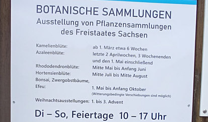 Voriges Jahr waren wir am 25. März hier ... ![]() ... in diesem Jahr sind wir ... ![]() ... etwas früher dran. Gerlinde aus Sachsen war auch in diesem Jahr wieder dort und schreibt: "Ja, ich war dort mit einer der Töchter. Zur Zeit ist die Kamelienblütenschau. Es sind im Schloss einzelne Blüten "in Szene" gesetzt, in den Gewächshäusern stehen viele kleine und große, junge und sehr alte Pflanzen. Aber da sind wir nicht gewesen, weil die Wege teilweise sehr eng und in der jetzigen Zeit auch mal matschig sind. Dieses "Schloss" ist ein sog. Landschloss und von einem großen Park umgeben." Und das sind die Bilder, die Gerlinde mitgebracht hat: ![]() ![]() ![]() ![]() ![]() ![]() ![]() Dieses Kamelien sind aus Wachs. ![]() Zusätzlich zu den Kamelien gab es auch noch Azaleen zu sehen. Wer gerne mehr Kamelien sehen möchte, der schaue sich gerne noch mal das Kalenderblatt vom letzten Jahr an :). |