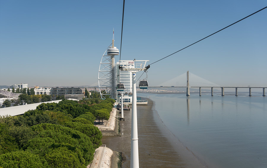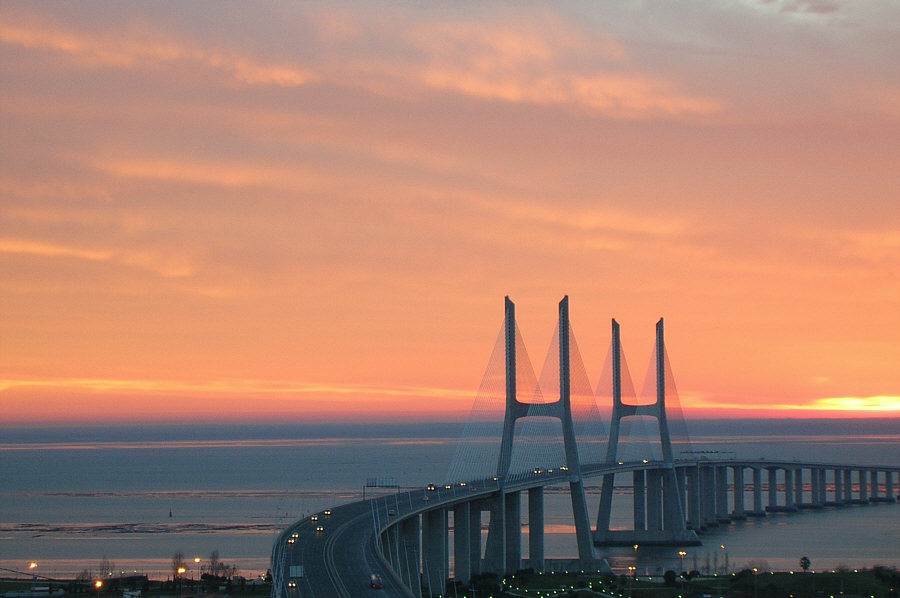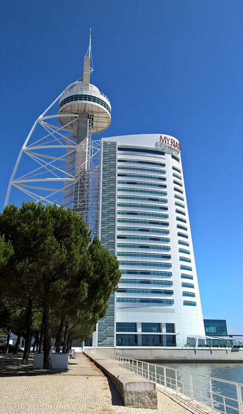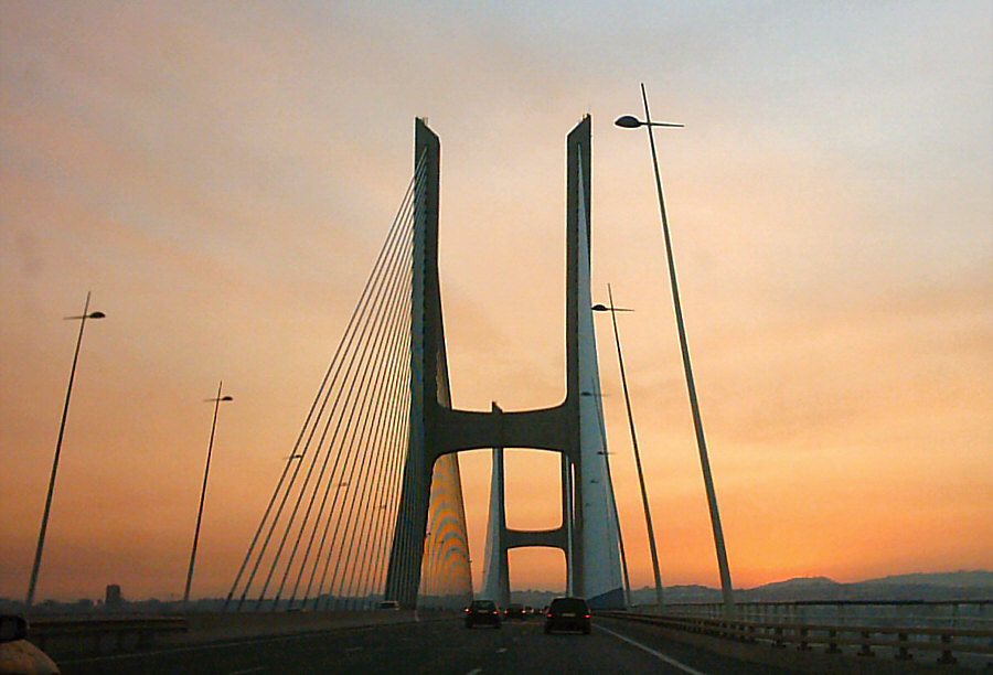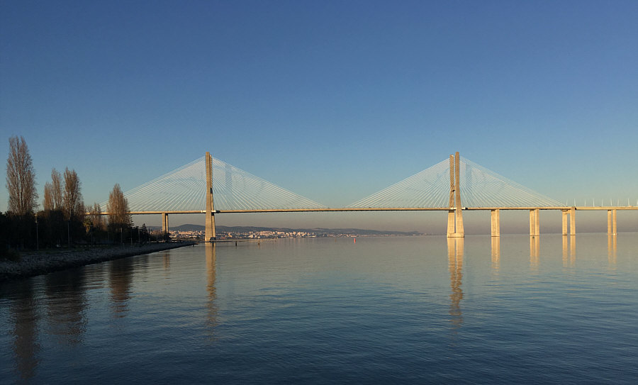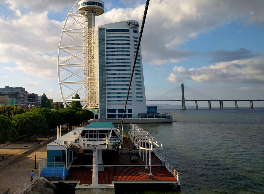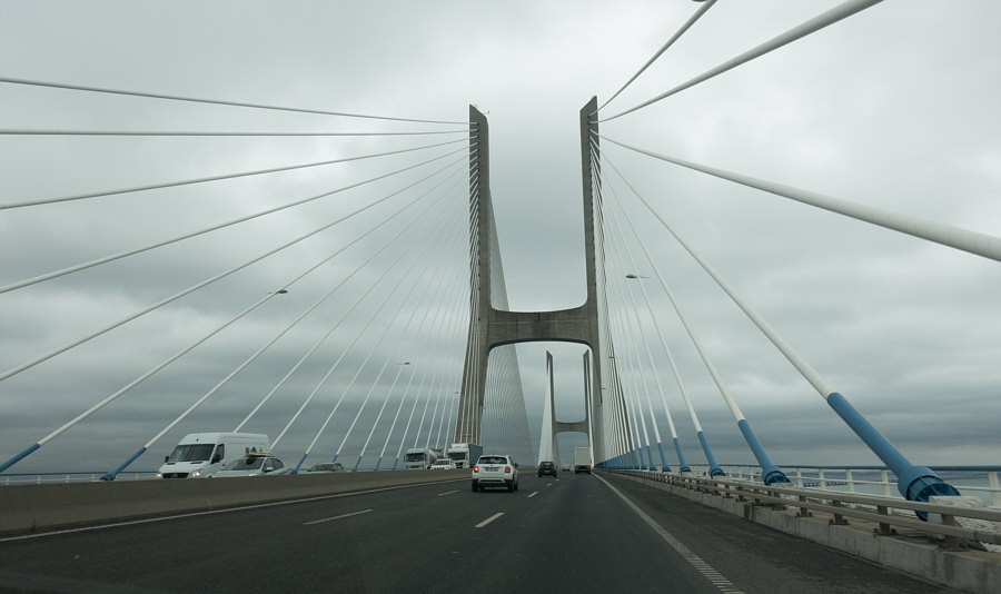 Das ... ![]() ... ist der "Vasco da Gama"-Turm. Er wurde 1998 anlässlich der Weltausstellung Expo 98 errichtet. Am Fuße des Turms befand sich damals ein dreistöckiges Gebäude, das während der Expo als Pavillon der Europäischen Union diente. 20 Jahre später war dieses Gebäude nicht mehr da und stattdessen stand dieses ... ![]() ... besonders designte Luxus-Hotel an dessen Stelle. Die Architekten ließen sich von der Form einer Karavelle und ihres Segels inspirieren. Diese Basis ragt wie der Bug des Bootes in den Fluss hinein. Der Fluss ist der Tejo. Und es gibt hier auch ... ![]() ... einen Steg zum Spazieren und eine Seilbahn, um über den Dingen zu schweben. Wir setzen uns mal in diese Seilbahn: ![]() ... und schweben der Haltestelle entgegen: ![]() Mit kommt es aber heute gar nicht auf die Seilbahn und auch nicht auf das Hotel an ... ... sondern auf die Brücke, die dahinter ist. ![]() Denn das ist die gleiche Brücke ![]() ... die ich gestern ... ![]() ... im Abreißkalender gezeigt hatte. Wir sind in Lissabon, das ist die Vasco-da-Gama-Brücke. Dieses Bild wurde morgens an einem Januartag fotografiert. Zwei weitere frühmorgens-Bilder: ![]() ![]() Wenn man auf der Brücke fährt, sieht das so aus: ![]() ![]() Ich zeige auch gerne die Brücke in ihrer ganzen Länge: ![]() Den Abschluss machen Bilder bei Nacht ... ![]() ... und auf dem letzten Bild ... ![]() ... ist wieder alles zu sehen ... Turm, Hotel, Seilbahn und die Brücke. |