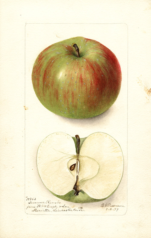 Ich fange mal mit einem Apfel an. ![]() Der Apfel heißt "Summer Rambo", das aber nur am Rande. Der "Summer Rambo" hat einen knackigen, leicht säuerlichen Geschmack. Wie die meisten Sommeräpfel ist auch dieser Apfel nicht gut lagerfähig und wurde deshalb nie in großem Umfang kommerziell angebaut. In Teilen der USA ist er Anfang August noch immer beliebt, sei es auf Selbstpflückplantagen, auf Bauernmärkten oder an Straßenständen. Es geht heute aber nicht um die Apfelsorten an sich, sondern um die botanische Illustratorin "Deborah Griscom Passmore". Die hat über 1500 (!!) solcher botanischen Zeichnungen gemalt, von Äpfeln, Birnen, Erdbeeren und alles möglichen anderen, was wächst und gedeiht und essbar ist. Ich will heute einfach mal eine kleine Bildergalerie von der Dame zeigen. Noch ein roter Apfel: ![]() Der "Winter Smokehouse"-Apfel. Bei den kommenden Bildern lasse ich jetzt die Sorten-Namen weg und schreibe nur dazu, welche Frucht das ist. Wobei man die ja sofort erkennt. ![]() Erdbeere. ![]() Kirsche. ![]() Pflaume. ![]() Mango. ![]() Avocado. ![]() Pfirsich. ![]() Weintraube. ![]() Orange. ![]() Mangostane. ![]() Brombeere. ![]() Kaktusfeige. ![]() Hickory-Nuss. ![]() Weiße Sapote. ![]() Surinam-Kirsche. ![]() Kumquat. ![]() Maulbeeren. ![]() Kaki. ![]() Sapodilla. |