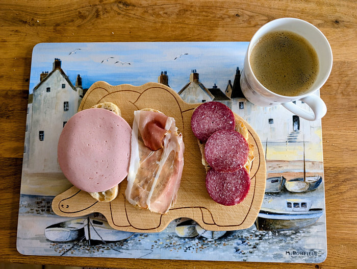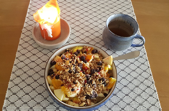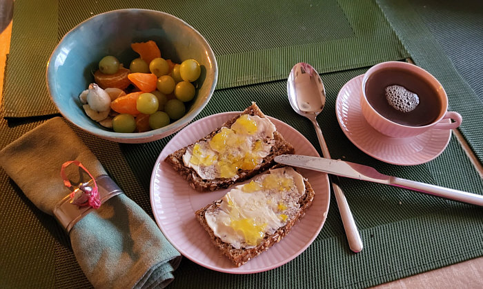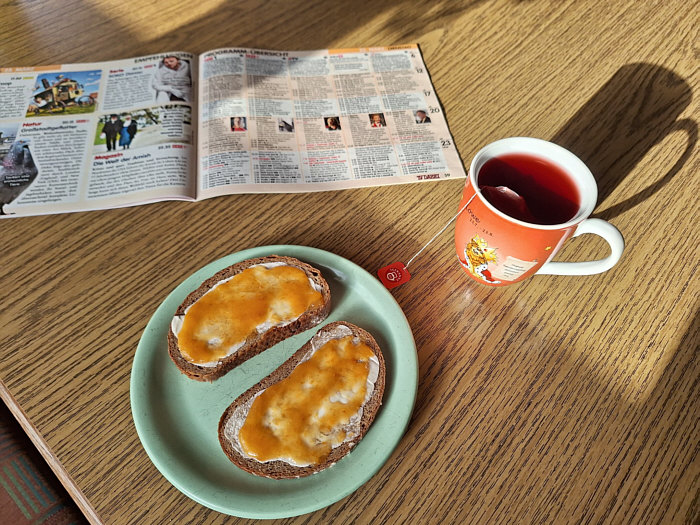 Ist das schön ... ganz aktuelle Bilder, alle von gestern Morgen und alle extra für Seelenfarben fotografiert ... wunderbar :). Weil mich das gerade freut, zeige ich die Bilder auch gleich und sage dann "Folge 1" dazu, denn die dazugehörige Mitmachaktion läuft ja noch bis zum 31. März. Willkommen beim Seelenfärbler-Frühstück Den Aufruf zur Fotoaktion gibts aktuell im Lichtblick. 5 Seelenfärblerinnen haben ganz spontan schon gestern Morgen ihr Frühstück fotografiert: Oktoberfee ![]() Mein Frühstück besteht aus einer Scheibe Haselnuß-Vollkornbrot, bestrichen mit Frischkäse, darauf halb Camembert halb Roquefort, bestreut mit gehackter Walnuß, dazu zwei Radieschen und eine Tasse Haselnuß-Milchkaffee. ~~**~~ Magret ![]() Ich habe gleich mal mein Frühstück aufgenommen, es ist täglich in etwa gleich, heute als Grundlage Hirsebrei (auch Reis, Haferflocken oder Müsli) und Obst und Nüsse nach Vorrat. ~~**~~ Greta ![]() Guten Morgen Engelbert, das ist ein Foto meines alltäglichen Frühstücks: Eine kleine Schale mit Obst - Banane, Weintrauben, Mandarinen (Apfel und Birne gibt es am Abend, da ich sie morgens nicht vertrage). Dann Brot mit Butter und selbst gemachte Marmelade. Dazu trinke ich Tee - viel Tee. ~~**~~ Birgit W. ![]() Heute noch ein Rest vom Ciabatta, von Göga liebevoll belegt mit Lyoner, Schinken und Salami. Und einen Pott Kaffee. ~~**~~ Liane ![]() Schönen Guten Morgen ... ich sitz grad beim Frühstück, die Sonne scheint auf den Küchentisch und ich werde mir jetzt den Hagebuttentee und Marmeladenbrote, mit der köstlichen, selbstgemachten Marillenmarmelade von meiner Freundin, schmecken lassen. Dabei lese ich immer die Fernsehzeitung, damit ich bis abends wieder vergessen habe, was ich mir anschauen will ;). ~~**~~ Fortsetzung folgt natürlich :)). |