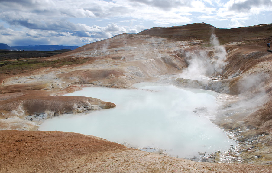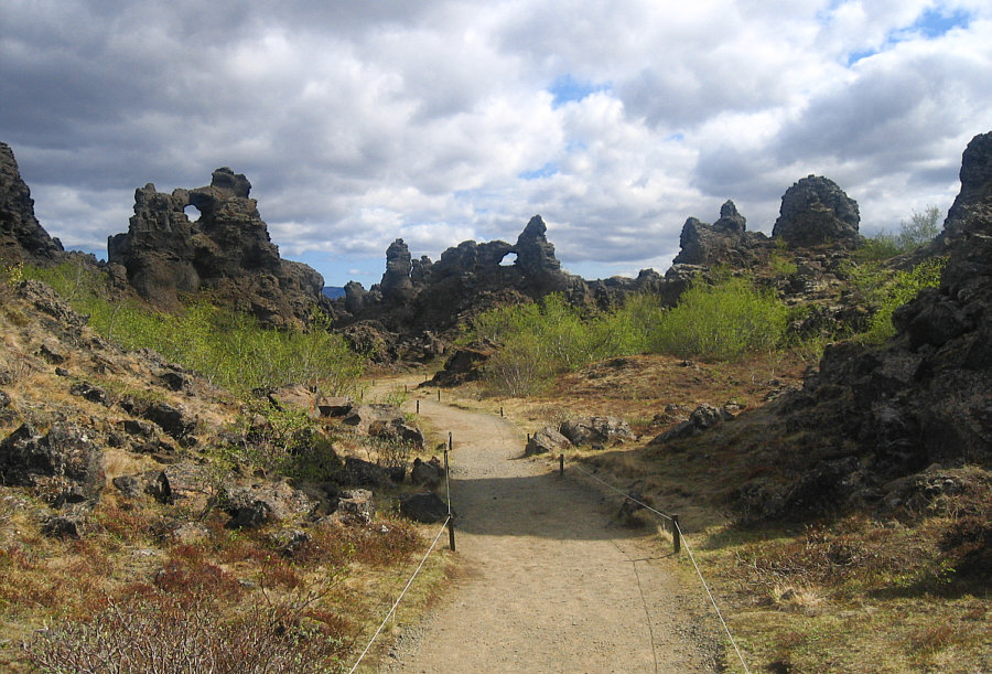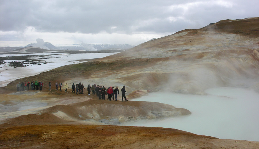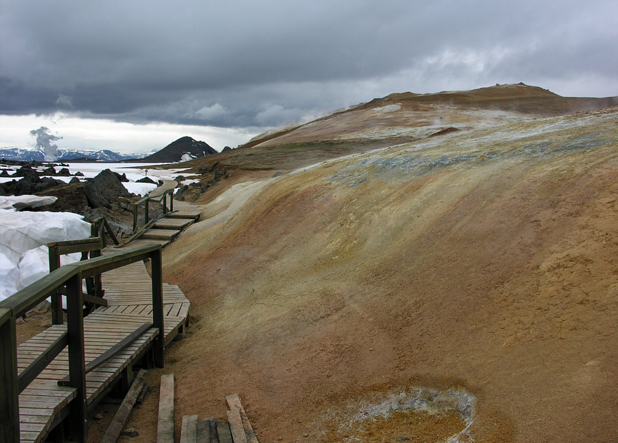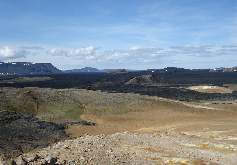 Es ist immer nur ein Bild, mit dem alles anfängt. Dann forsche ich weiter nach und stoße auf dies und das und muss dann nicht nur das eine Bild, wie geplant, zeigen, sondern ein wenig weiter ausholen. Ich wollte eigentlich nur ein Bild von einer dampfenden Schwefelquelle zeigen. Dann habe ich geschaut, wo die zu finden ist ... obs weitere Bilder gibt und nun sind wir am heutigen Freitag in Island gelandet. Wo sicher der eine oder die andere mal gerne persönlich vorbeikommen würde, aber so wie das Leben eben ist, hat das bisher nie geklappt und das wird auch in Zukunft eher nicht der Fall sein. Aber es gibt ja das Internet und das Kalenderblatt. Und so gibt es Holzstege ... auf die stellen wir uns jetzt mal virtuell drauf: ![]() Da vorne der Berg ist der Leirhnjúkur, wir sind ziemlich im Norden von Island. Je nachdem, wann man dort ist, gibts dort noch Schnee und Eis. Vom Gipfel aus hat man diese Aussicht: ![]() Alles schwarz ... alles verbrannt ? Jein ... eigentlich ja ... das ist Vulkanasche. Wir stehen auf einem aktiven Vulkan, der Berg sitzt auf einer vulkanischen Spalte und ist Teil des Vulkansystems Krafla. Man sieht und spürt es ... auch auf dem Gipfel ... der Berg ist immer noch recht heiß, oder doch zumindest warm ... je nach der Stelle, an der man ihn berührt. Das sind die ... ![]() ... die Schwefelquellen am Rand des Berges. Links und rechts sehen wir Stege für die Touristen. Und es sind auch bisweilen genügend davon da: ![]() Nochmal ohne Menschen ... ![]() ... dieses Bild hatte ich zuerst gesehen und wollte auch eigentlich nur dieses zeigen. Eigentlich ... aber uneigentlich habe ich dann mal weiter gesucht, wo wir denn genau sind und was es noch so gibt. Zum Beispiel einen See namens Mývatn ... ![]() ... wo es ... da links hinten ... ![]() ... sogenannte "Pseudokrater" gibt. ![]() Diese Krater haben selbst nicht vulkanisches Material ausgestoßen, sondern sind durch das explosive Zusammentreffen von Lava und Wasser entstanden. So sieht man sie besser ... ![]() ... und so sehen sie von oben aus: ![]() Es gibt also Wege zwischen den Kratern. Vom "Pseudo"-Krater zum echten ... der gar nicht weit vom See entfernt ist und sogar bestiegen werden kann ... das hier ist der ... ![]() ... Hverfjall ... da gabs vor 2500 Jahren gewaltige Wasserdampfexplosionen, ausgelöst, als heißes Magma auf Grundwasser stieß. Dieser Ring hat 1 km Durchmesser und ist 90-150 Meter hoch. Es gibt auf der Erde nur wenige Krater dieser Entstehungsart. Zum Abschluss noch ... unterhalb dieses Kraters ... ![]() ... liegt das Gebiet Dimmuborgir mit seinen reizvollen Tuffsteinformationen. Die bizarr geformten Steinformationen des Lavafelds erinnern an verfallene Ruinen von Burgen und Türmen. In der isländischen Mythologie wird Dimmuborgir als Unterkunftsort von Elfen und Trollen gesehen. Und noch was liegt in der Nähe des Sees ... Grjótagjá ... das ist eine Höhle ... ![]() ... mit einem kleinen See drin, der durch geothermische Aktivität sogar schön warm ist. Es gäbe noch so viel zu erzählen und zu entdecken in diesem ganz besonderen Land im hohen Norden. In das wir heute ganz einfach per Mausklick reisen dürfen :)): |