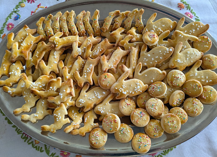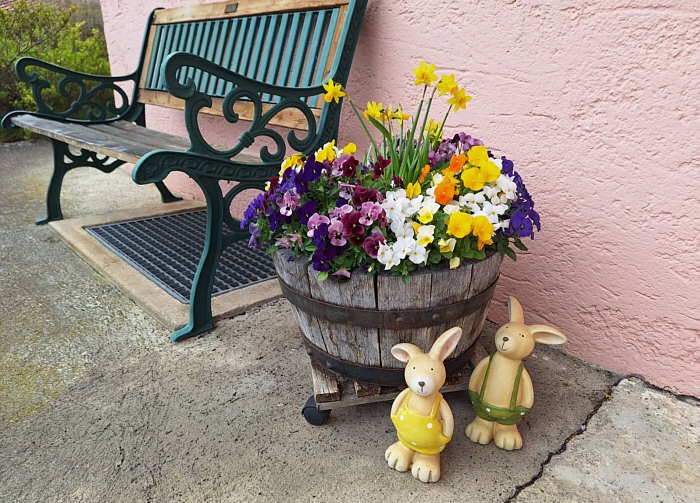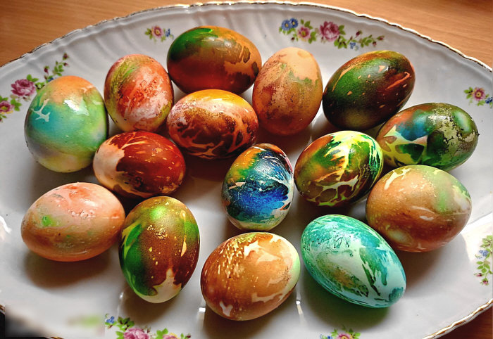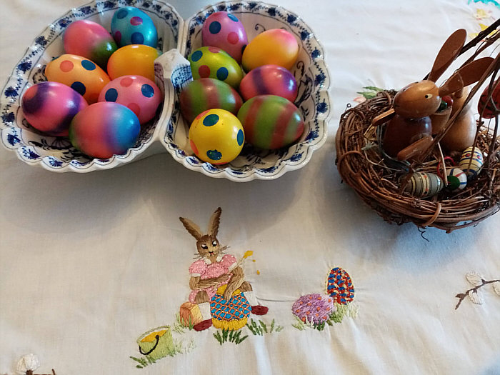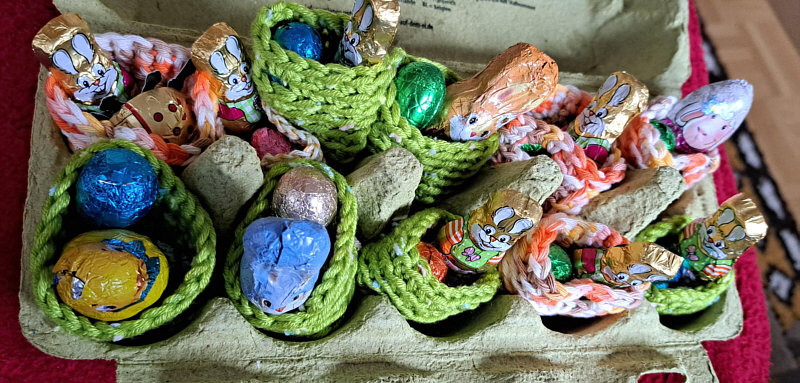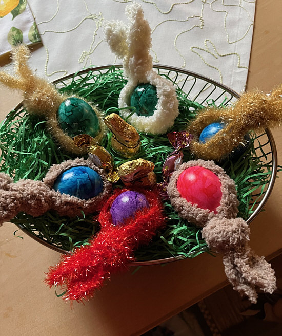 ![]() Teil 1 Der Aufruf war im Tagebuch und innerhalb eines Tages hatte ich genügend Bilder für zwei Folgen Seelenfärbler-Ostern. Ein bunt gemischtes Kalenderblatt rund um Ostern. Onyxia ![]() Zuerst sammelt man Zwiebelschalen. Dann sammelt man kleine Blättchen. Man braucht eine (alte)Feinstrumpfhose und Faden. Onyxia hatte hellbraune Eier. Man legt die Blättchen auf das Ei und spannt ein Stück der Feinstrumpfhose über die Blättchen um das ganze Ei. Nun bindet man mit dem Faden die Feinstrumpfhose eng zu und schneidet den Rest ab. Die Eier kocht man 10 Minuten in Zwiebelschalenessigwasser. Auspacken und überraschen lassen ;). Onyxia sagt: "Also ich bin noch nicht so geschickt, dass ich das alleine hinbekomme, ich brauche Männes beide Hände auch noch dazu. Anita ![]() Kleine Ostermitbringsel für die Häkelgruppe, sicher reisend im Eierkarton. _gerlinde ![]() Dorle wartet seelenruhig auf das Osterfest und unterhält sich dabei mit den Stiefmütterchen. Christa U. ![]() Osterschmuck, noch aus DDR-Zeiten Moni ![]() Bei Dali in Figueras ist immer Ostern. Inge-Lore ![]() Das sieht mir nach einer nostalgischen selbstgestickten Ostertischdecke aus. Ingrid S. ![]() Selbst gestaltetes Ei auf Balkonien. liane ![]() Osterdekoration vor Lianes Haus. Annemone ![]() Annemone sagt "nom nom" dazu ... ich befürchte, die Eier wurden schon vor Ostern gegessen ;). ReginaE ![]() Oster-Ausstecherli ... Rezept unter der Kommentarfunktion. Oktoberfee ![]() Selbst Gehäkeltes gibt es bei Oktoberfee. Christa SF ![]() Österliches fotografiert am Wegesrand bei den täglichen Radtouren. Petra H. ![]() Die Eier werden gekocht. Dann in Küchenpapier eingewickelt, zugebunden und dann kommen ein paar Spritzer verschiedene Lebensmittefarben drauf. Kurz ins Wasser getaucht und 1h so liegen lassen.