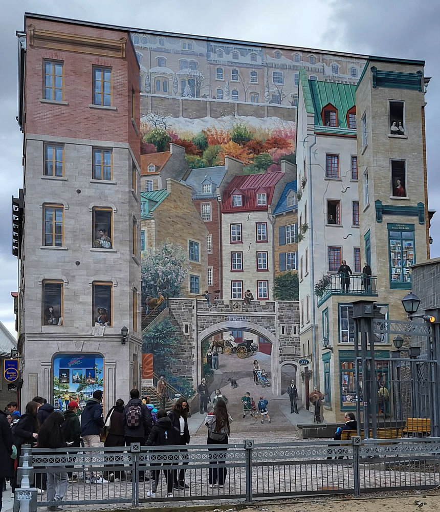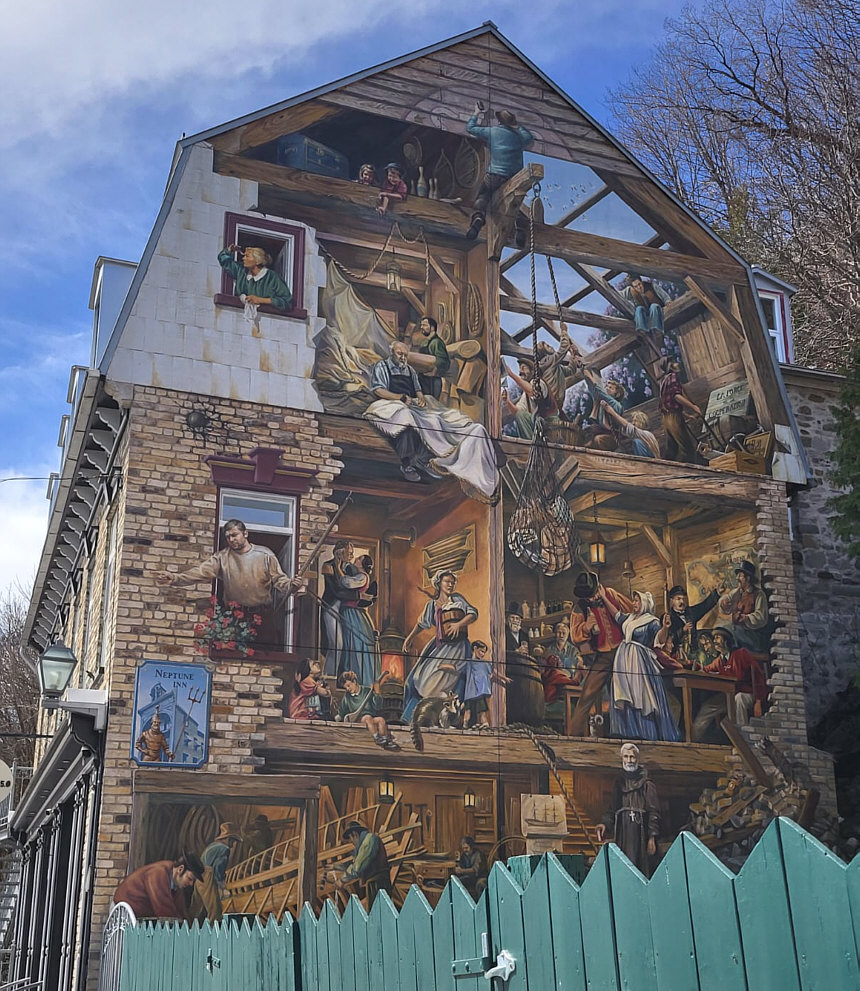 Ist das Internet nicht toll ? Da steht Satu im über 5.500 Kilometer entfernten Quebec in Kanada, fotografiert mit dem Handy ... ... und eine Sekunde später hab ich das Bild auf meinem Handy. Über 10 Stunden müsste man fliegen, bis man dort ist. Doch wir können uns zwei ganz toll bemalte Häuser anschauen, ohne auch nur einen Schritt zu gehen ... einfach per Mausklick. Es lebe das Internet. Und Satu. Und Kanada. Und Quebec. Und das Bild "Fresque des Québécois" an diesem Haus: ![]() 400 Jahre Stadtgeschichte in einem Bild. Auch das Fresko von Petit-Champlain, 100 m² groß, zeigt verschiedene Phasen der Geschichte des Viertels Cap-Blanc, einem ehemaligen Hafenviertels im unteren Teil der Stadt. ![]() Gestern nah vor der Haustüre ... heute ganz weit weg und doch so nah, wenns um Bilder und Infos geht. |
