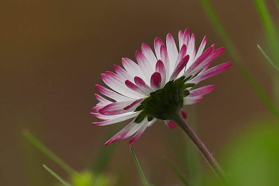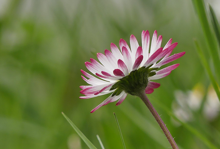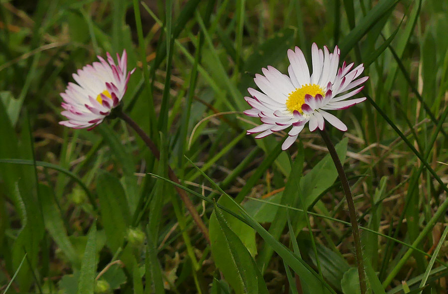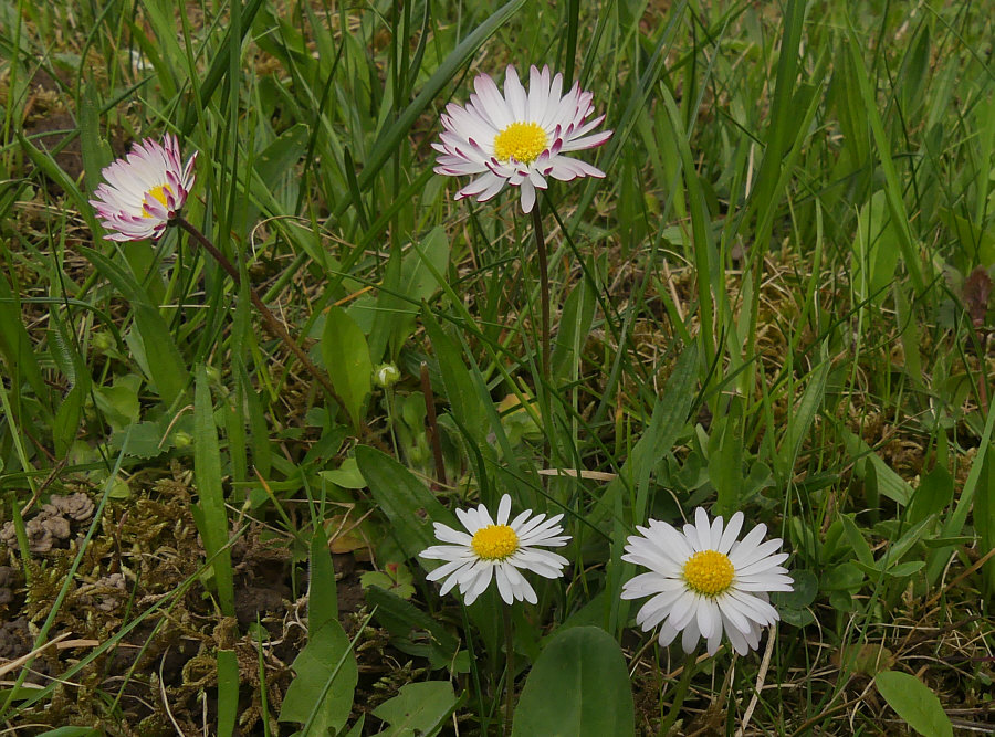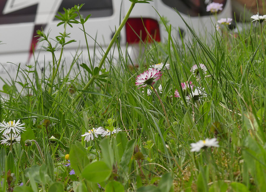 Vor ein paar Tagen fotografiert ... ![]() ... eine etwas geordnete Natur mit weißen Blümchen. Mehrere weiße Blümchen. Ich selbst hatte aber nur Augen für eines davon ... ![]() ... das da in der Mitte, das im roten Kreis. ![]() Denn die meisten Gänseblümchen sind nur weiß oder haben einen leichten roten Rand ... ein so kräftiges Rot ist eine besondere Erscheinung. Eine besonders schöne Erscheinung. Die von vorne so aussieht: ![]() Oben das rechte meine ich ... ![]() ... das habe ich mal einzeln fotografiert, so, dass man die roten Blätter besonders gut sieht. Einmal vor grünem und einmal vor braunem Hintergrund: ![]() ![]() |