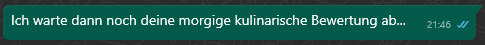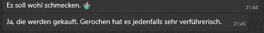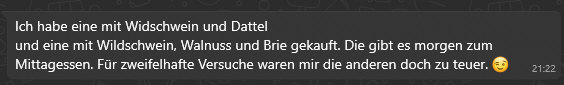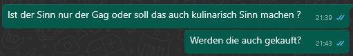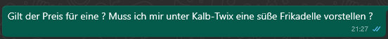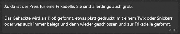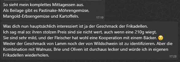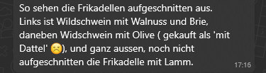 Vor gut einer Woche gabs hier diese ... ![]() ![]() ![]() ... seltsamen, sonderbaren, originellen, leckeren (je nach Ansichtsweise) Frikadellen. Ich hatte ja gesagt, dass eine Seelenfärblerin sich zwei davon gekauft hat. Hier das Whats-App-Chatprotokoll und die Bilder dazu: ![]() ![]() ![]() ![]() ![]() ![]() ![]() ![]() ![]() ![]() |