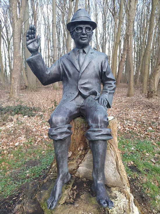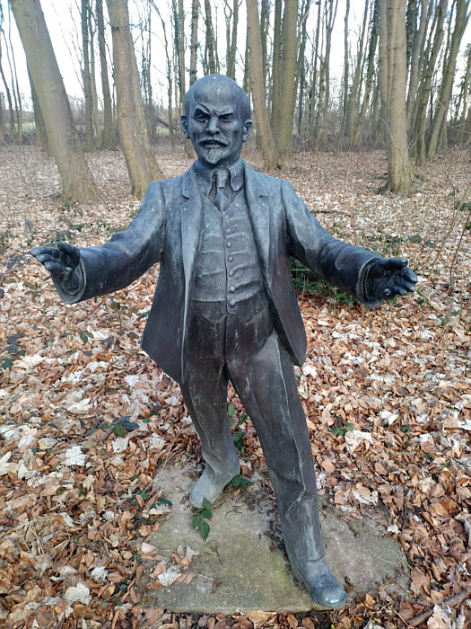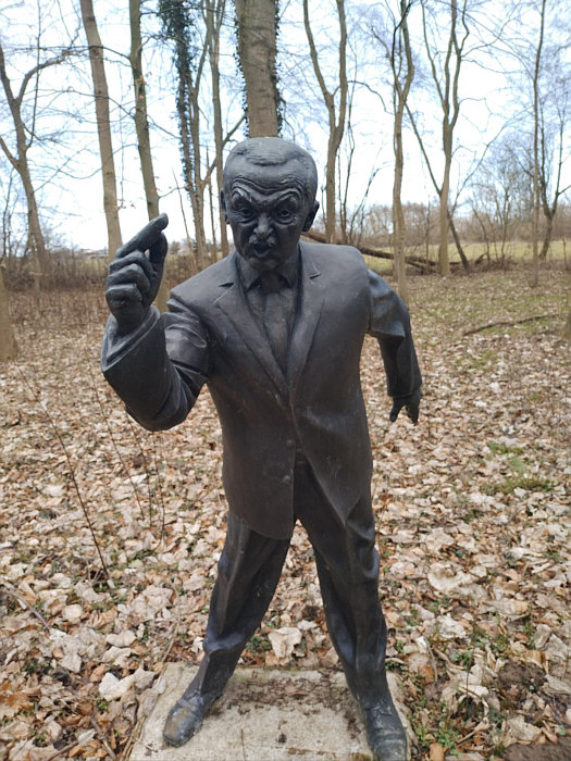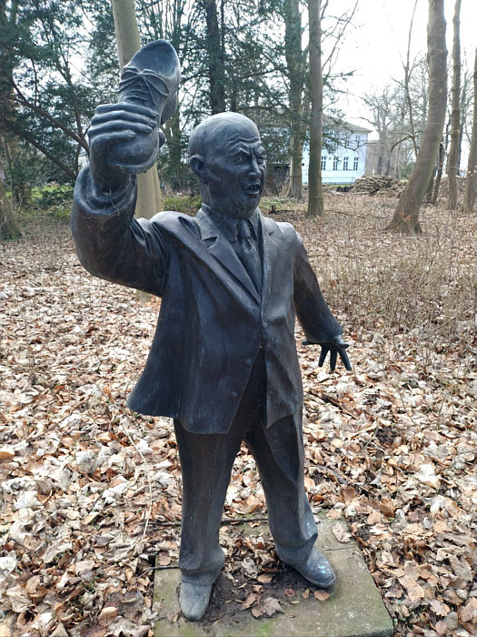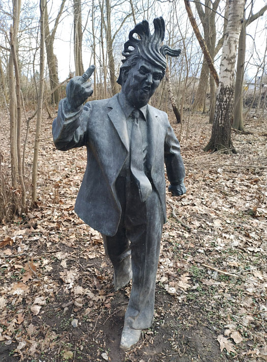 (aus Wikipedia) Der Lehrpfad der unholdigen Personen ist ein etwa 1,3 km langer Skulpturenweg im Wald des Gutshauses Klein Strömkendorf in der Gemeinde Am Salzhaff an der Ostsee in Mecklenburg-Vorpommern. Auf dem Pfad befinden sich als Unholde sechs lebensgroße Statuen von George W. Bush, Nikita Chruschtschow, Recep Tayyip Erdoğan, Erich Honecker, Wladimir Iljitsch Lenin und Donald Trump aus Bronze. George W. Bush wird mit einem schreienden Baby in den Händen dargestellt, das ihm Eltern am 13. Juli 2006 bei einem Deutschlandbesuch in Trinwillershagen überreicht hatten. Nikita Chruschtschow wird in einer Szene auf der Konferenz der Vereinten Nationen am 12. Oktober 1960 nachgestellt, bei der er angeblich einen Schuh in den Händen gehalten haben soll. Von Donald Trump heißt es, dass er häufiger den Mittelfinger zum Richten seiner Haare benutze, etwa beim G7-Gipfel in Taormina 2017. Die Idee zum Pfad stammte von Marita Gronau, der Besitzerin des Gutshauses, und ihrem 2017 verstorbenen Lebensgefährten Thomas Petsch. Die Statuen stehen teilweise auf dem Grundstück, teilweise im Landesforst. Die Installation von Hitler und Stalin als Statuen lehnt Gronau ab. Den Auftrag für eine Statue von Wladimir Putin sagte die polnische Gießerei mit Verweis auf Sorgen vor Putin seit dem russischen Überfall auf die Ukraine 2022 ab." Die "Unholde" im Bild: ![]() ![]() ![]() ![]() ![]() ![]() |
