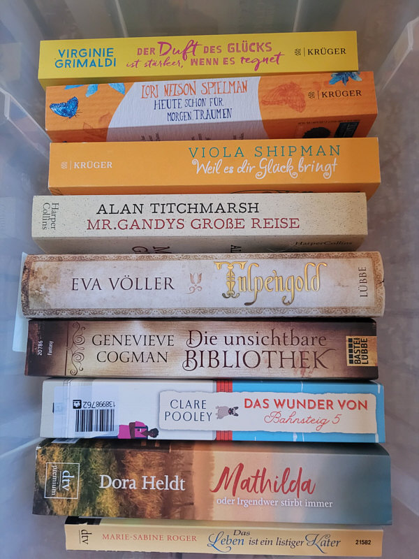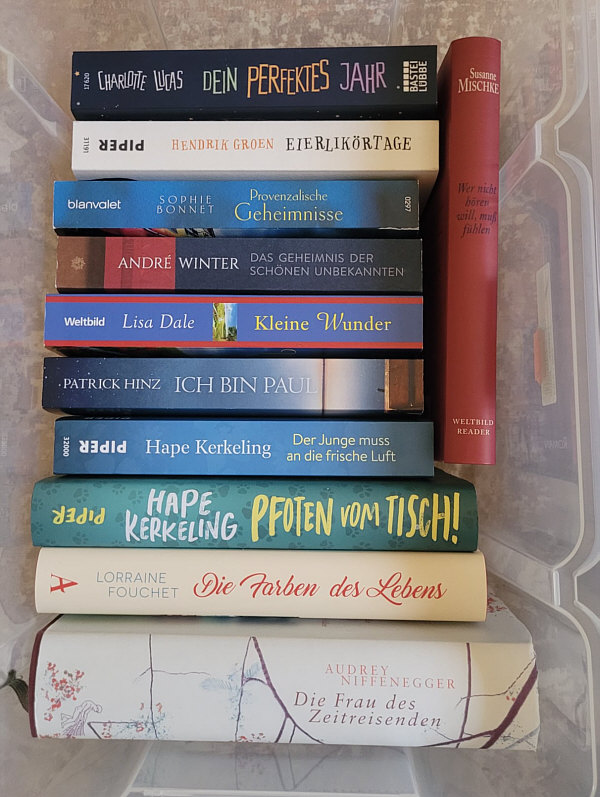 Kommt doch mal mit ... ... unter Beates Bett. Denn dort liegen die Kisten mit den Büchern, die Beate noch lesen will. Heute also ein ganz privater Einblick in Beates Lesewelt. Natürlich sind das viele Bücher und da Beate nicht Tag und Nacht liest, wird es eine Zeit lang dauern, bis Beate die Bücher gelesen hat. Während dieser Zeit kommen womöglich wieder neue dazu, aber das kennt jeder, der liest, ja sehr gut ;). ![]() ![]() ![]() ![]() ![]() ![]() |