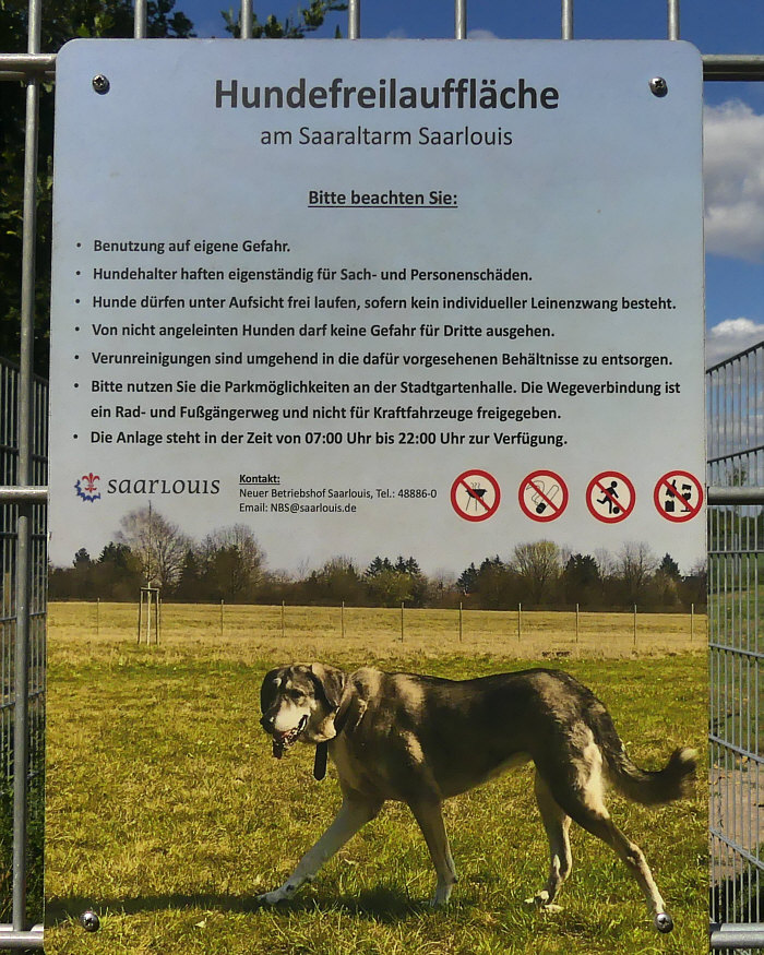 Gestern waren wir an der "alten Saar" in Saarlouis spazieren. Das müsst Ihr euch als geraden betonierten Weg für Fußgänger und Fahrradfahrer vorstellen. An der einen Seite ist der Alt-Saar-Arm zu finden, an der anderen Seite mal Wald mal Grünflächen. Auf einmal kam wir an einer eingezäunten Fläche vorbei. ![]() ![]() Ziemlich große Fläche ... eben ... gemähter Rasen oder Wiese ... wie man das nennen mag. ![]() Einzelne Sitzgelegenheiten ... ![]() ... einzelne Baumstämme, Holzpflöcke ... ![]() ... einzelne Bänke ... Abfalleimer ... ansonsten ... ![]() ... eine eher "ereignisarme" Fläche. Wir wären dann einfach weiter gegangen und ich hätte auch diese Bilder nicht gemacht ... ... wenn es da nicht dieses Schild gegeben hätte: ![]() Wie toll ist das denn ? Noch nie gesehen so etwas ... ... Hunde können ja auf dem Weg nicht frei laufen, weil in Saarlouis das freie Laufenlassen von Hunden im gesamten Stadtgebiet nicht erlaubt ist und eine allgemeine Anleinpflicht besteht. Hier aber, auf der Hundefreilauffläche, dürfen Hunde frei laufen. Auf diesem schönen ebenen, großen Areal. Frauchen und Herrchen haben einen Sitzplatz und der Hund darf rumtoben, wie er will. |