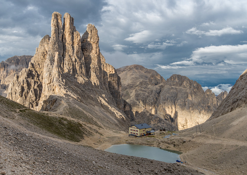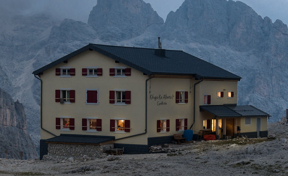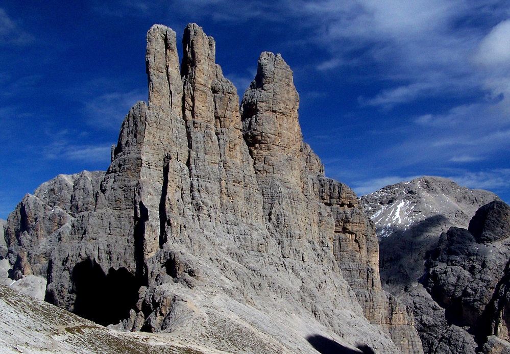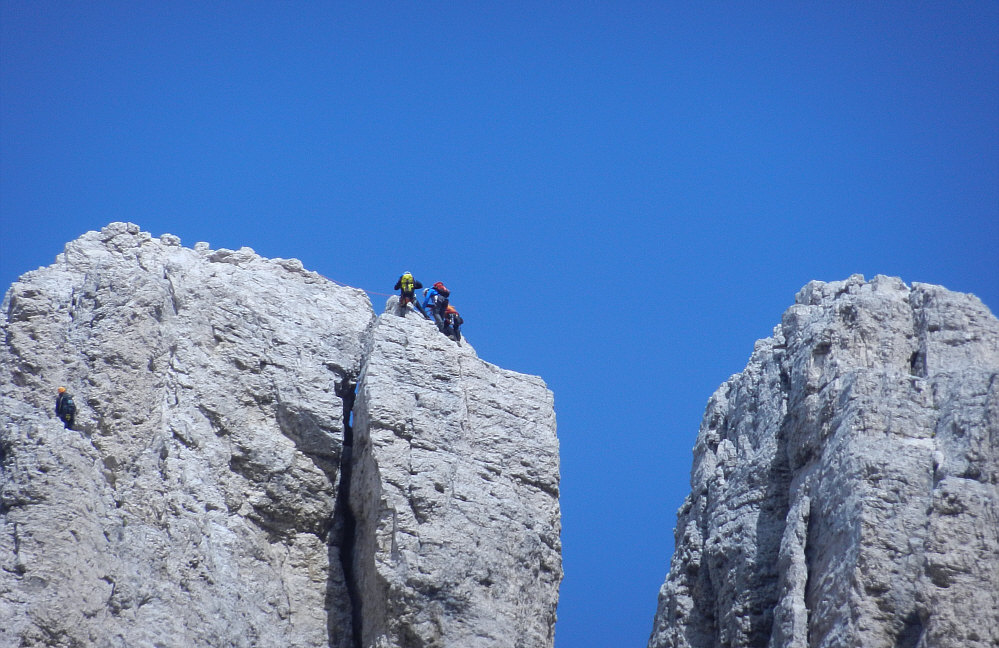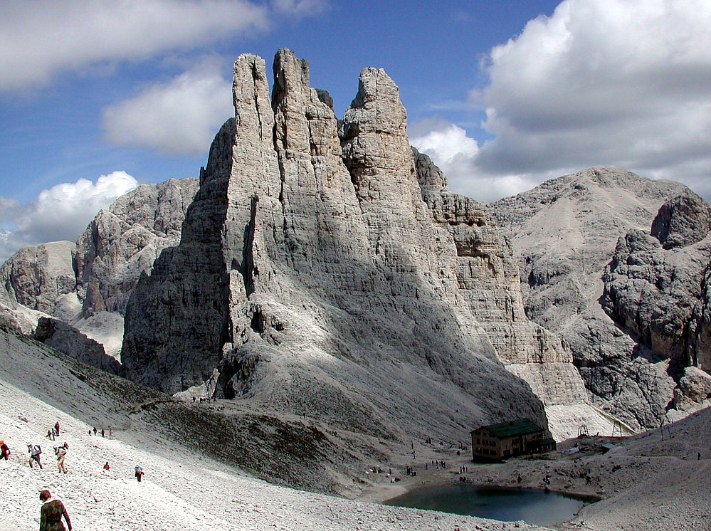 Das ... ![]() ... sind gewaltige Berge. Oder besser Felsen. Oder ganz genau: die Vajolet-Türme. Diese Türme sind eine bizarre Felsformation im Zentrum der Rosengartengruppe in den Südtiroler und Trentiner Dolomiten. Weil man ja einen Eindruck von der Größe dann am besten hat, wenn etwas auf dem Bild ist, dessen Größe man kennt ... erweitere ich das Bild mal nach unten: ![]() Das ist die Gartlhütte auf 2621 Metern Höhe. Die Hütte ist ein Stützpunkt für Klettertouren in den umliegenden Bergen, insbesondere an den gleich nordöstlich aufragenden Vajolet-Türmen, aber auch an der etwas südlich gelegenen Rosengartenspitze. In einer Viertelstunde ist man am linken Turm. Die drei Türme sind im Schnitt 2800 Meter hoch. Das sind also noch keine 200 Höhenmeter, aber die haben es in sich. Das ist die Hütte: ![]() ![]() ![]() Da kann man schon ehrfürchtig werden. Eine etwas andere Perspektive, bei der die Türme vor anderen Bergen stehen: ![]() Seht ihr da links den Weg ... da laufen die Bergwanderer und Bergsteiger und Höhenverliebte entlang: ![]() Das können auch schon mal ein paar mehr sein: ![]() Guckt mal da oben die Spitzen der Türme ... die von den beiden links ... ![]() ... genau dort wurde das nächste Bild fotografiert: ![]() |