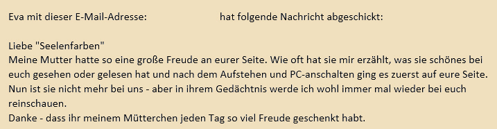 Gestern erhielt ich diese Mail: ![]() Meine Antwort: Eva hat mir darauf hin wieder geantwortet: ![]() Ich mailte daraufhin Eva dieses: ![]() Evas Antwort: ![]() Mich haben diese Worte sehr berührt und ich möchte sie gerne an Euch weiter geben. Ich finde es ganz toll, dass sich Eva bei mir gemeldet hat. |
