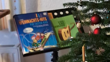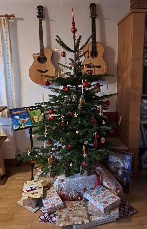 Gitarren an der Wand und Weihnachtslieder auf dem Notenständer: